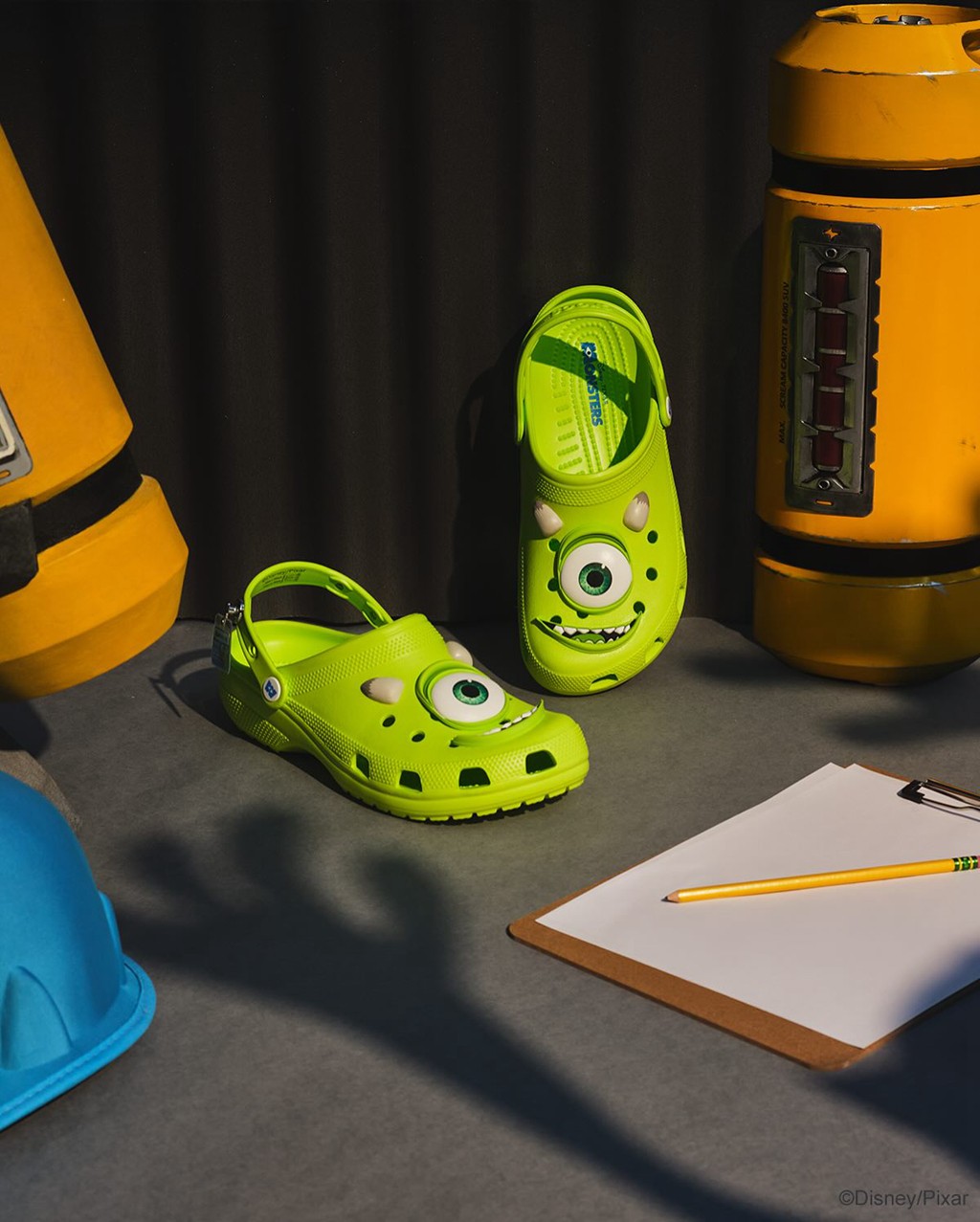 大眼仔的鞋款设计以经典洞洞鞋为设计蓝本,提取了怪兽公司中经典角色大眼仔(Mike)醒目的亮绿色为鞋面主基调,展现了角色具有代表性的色彩。