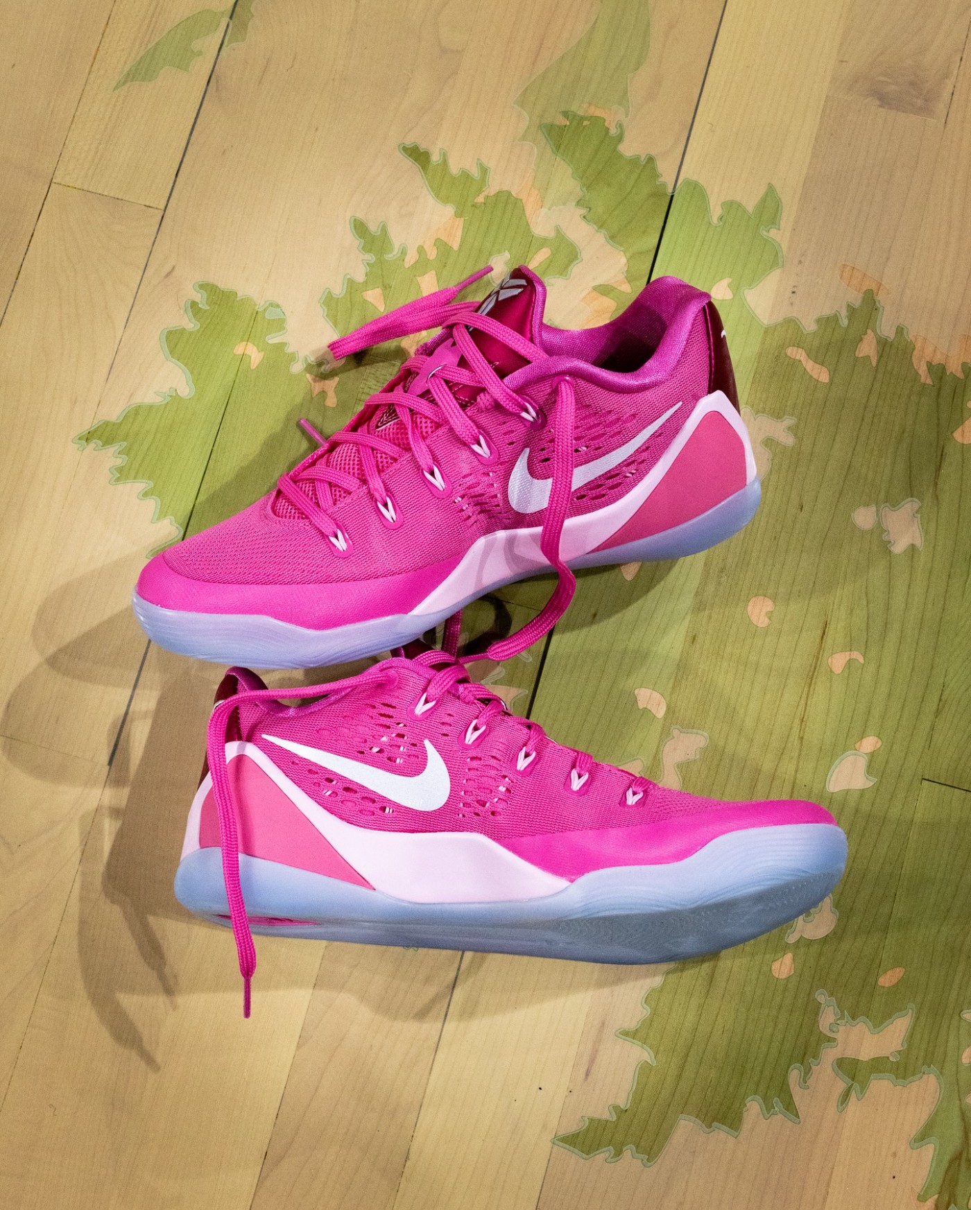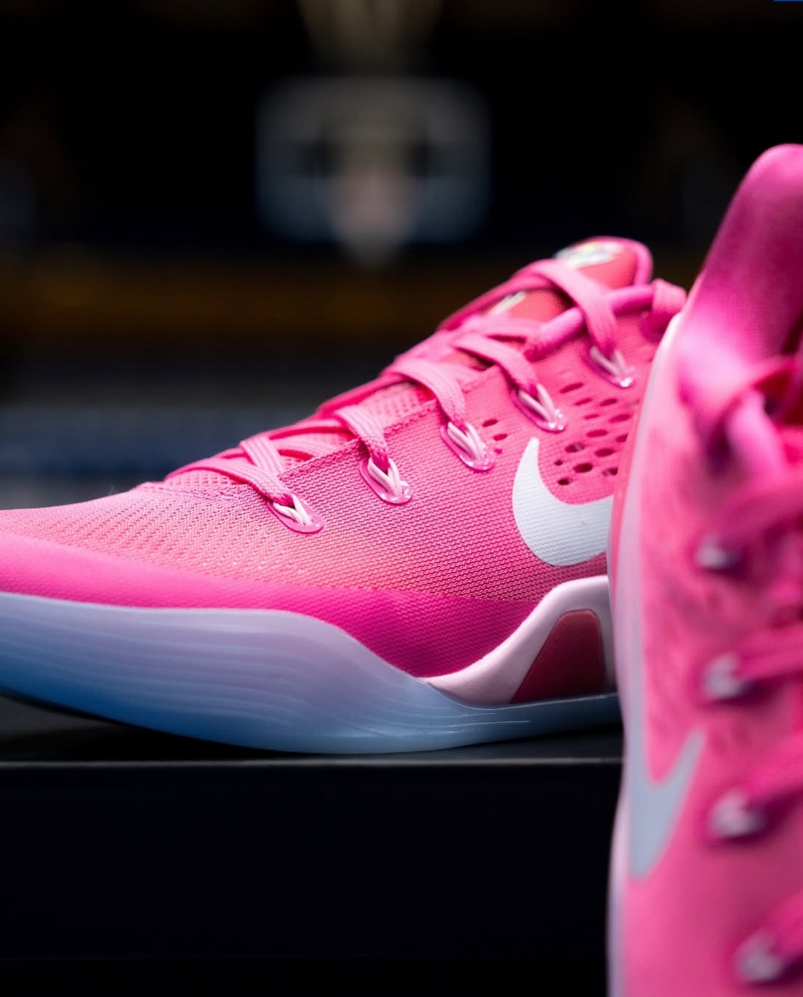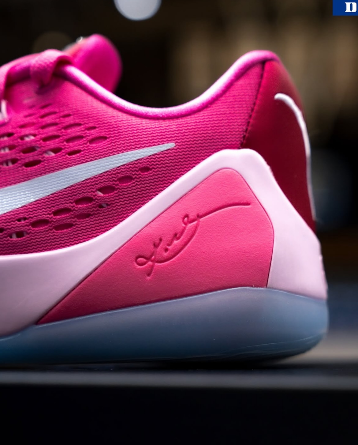 这双 Kobe 9 EM “Kay Yow” PE 有着标志性的 “粉丝带” Logo,全粉的色调笼罩,带来独一无二又格外醒目的视觉辨识度。