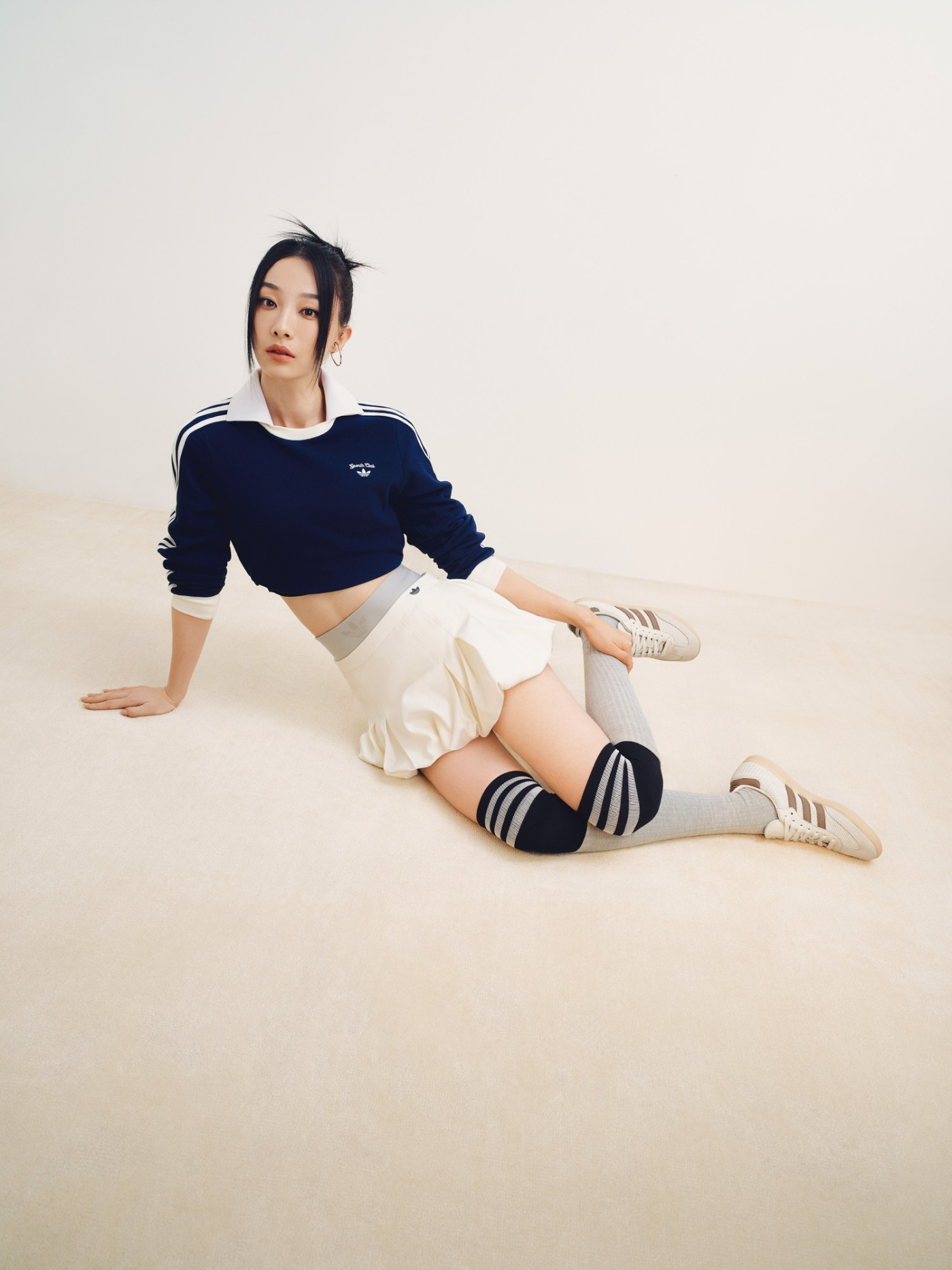 胡麟鹏则是选择精英学院感的短款针织上衣和蓬蓬裙,搭配具有复古氛围的透气网格 Samba,展现俏皮感十足的时尚运动风。