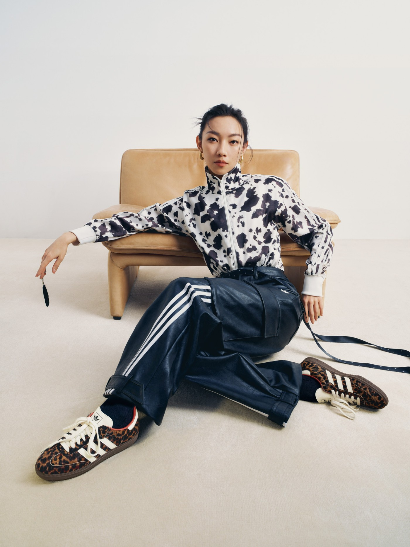 那尔那茜上身奶牛纹运动夹克,搭配豹纹 Samba,辨识度拉满,尽显个性。