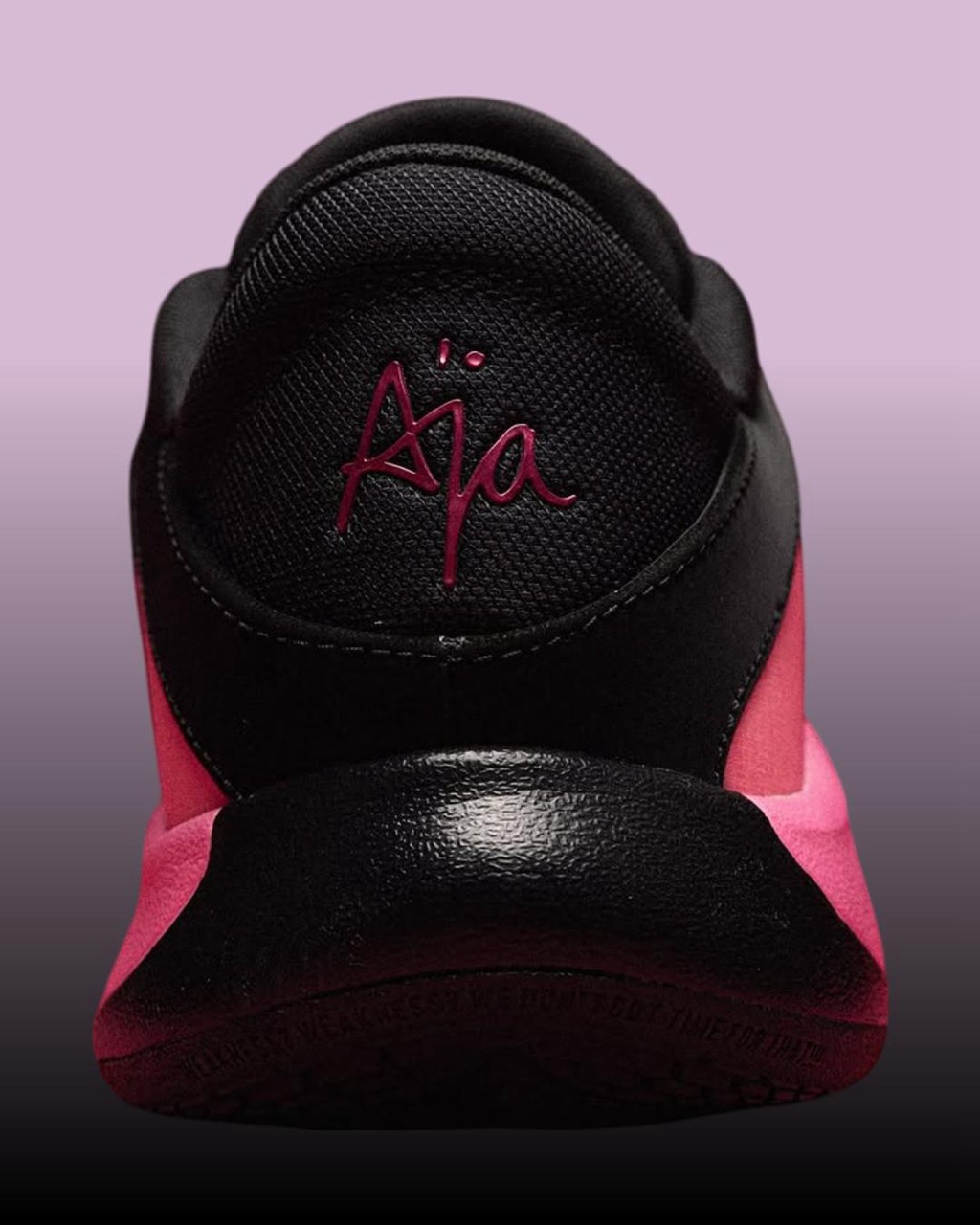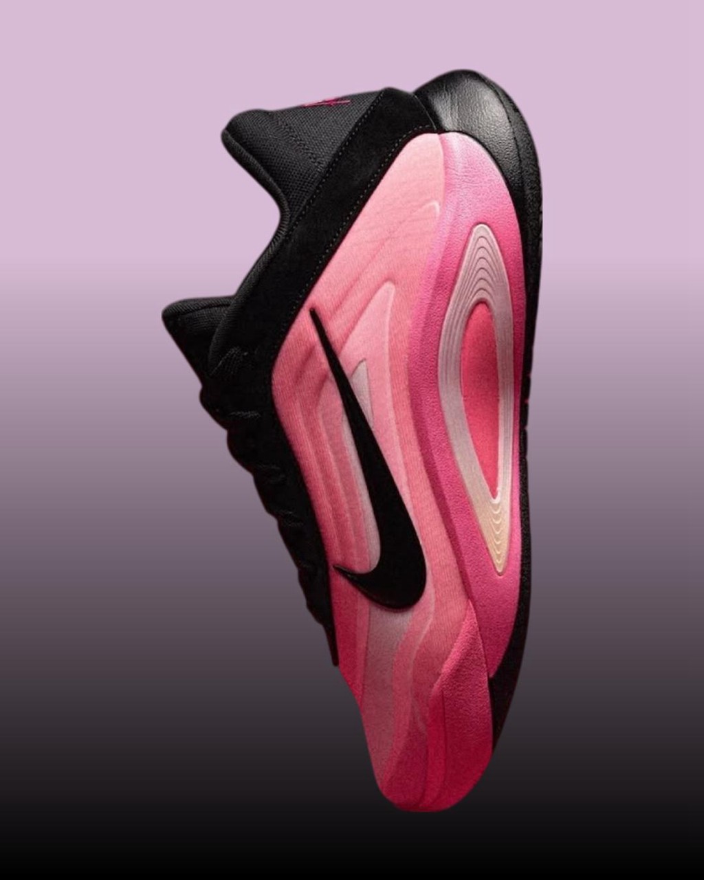 鞋身最具标志性的层叠渐变粉色得以延续,转而将鞋帮鞋舌登出覆盖深邃黑色。