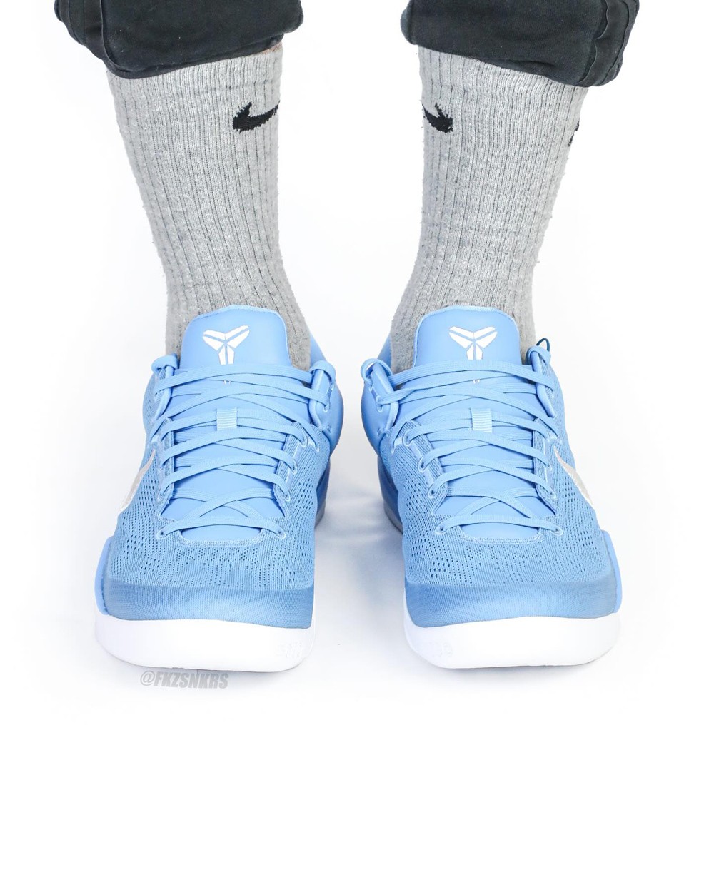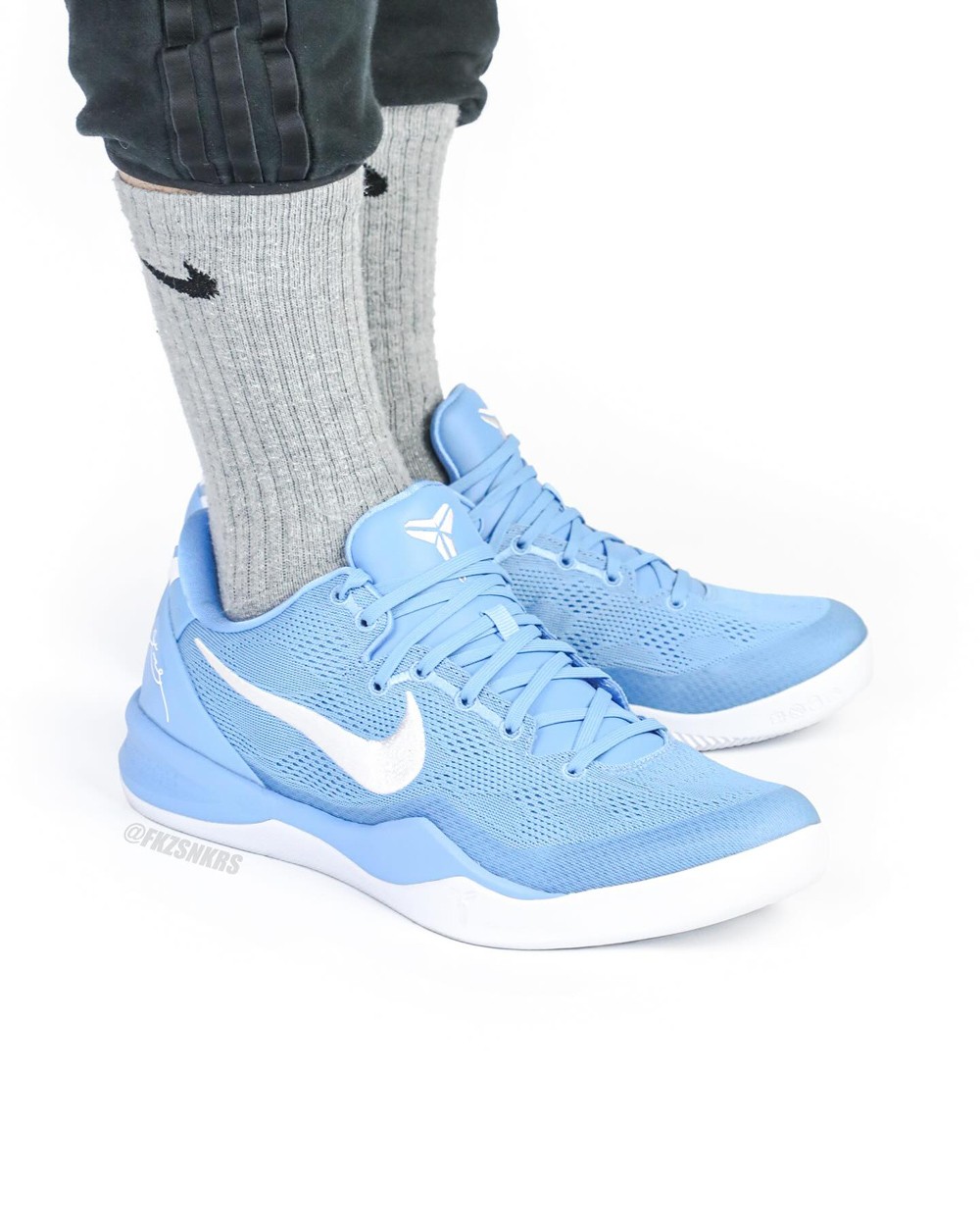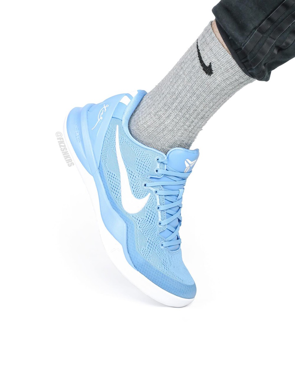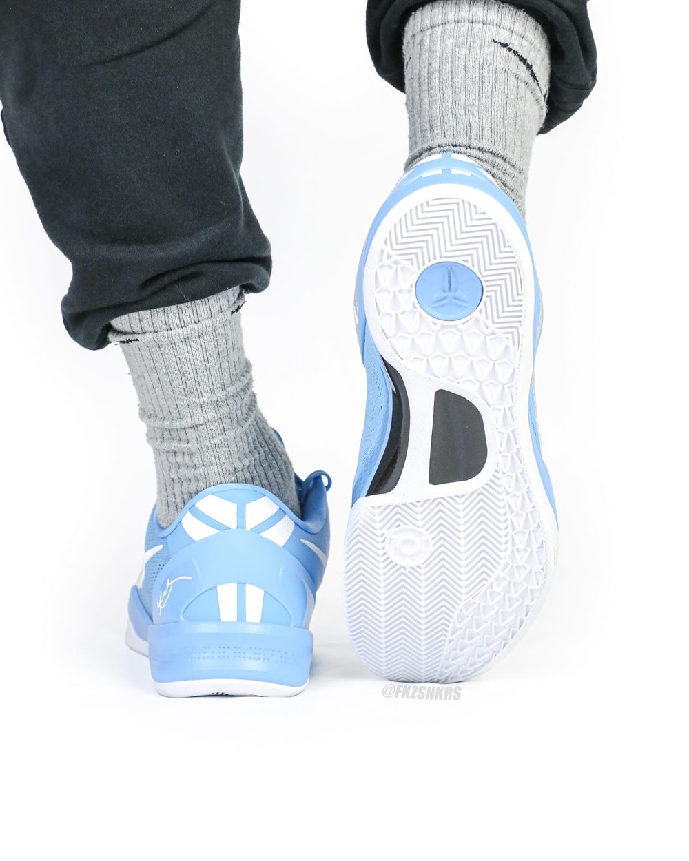 不得不说,北卡蓝还是有着让人难以抗拒的吸引力,结合后跟白色 Kobe Logo 与同样白色的外底衬托,清爽视觉无疑更契合球场和日常春夏上脚。