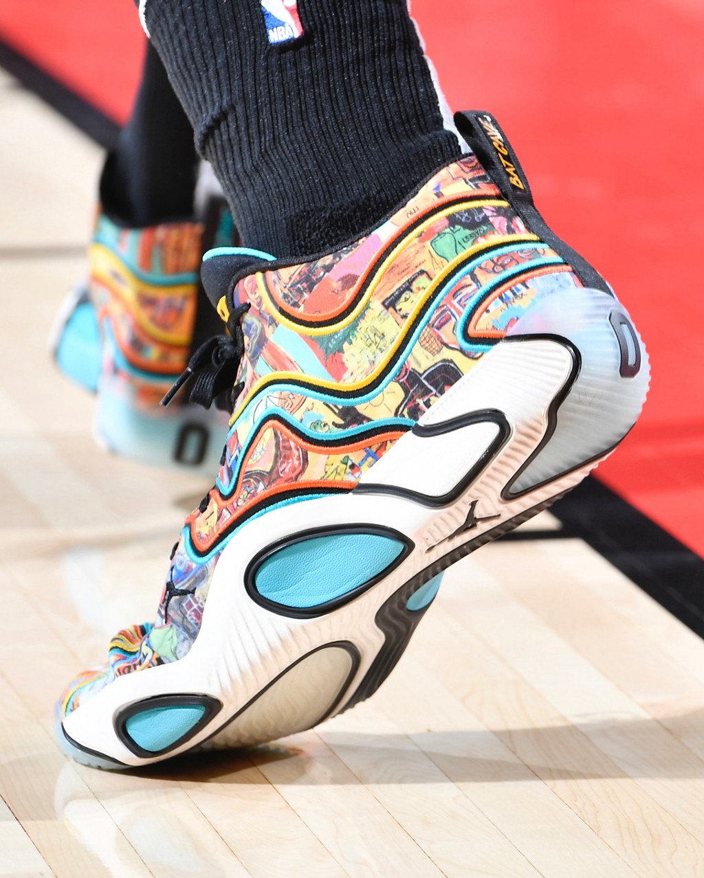 在最近的比赛中,魔术新星班凯罗上脚了一双从未见过的 Tatum 3 PE,非常吸引眼球。 鞋面丰富的图案装扮,让他在球场上显得与众不同。 而根据消息,这双配色设计灵感也十分有趣。 鞋面的图案源自班凯罗在西雅图老家的一处 “训练秘密基地”,图案其实就是训练馆中墙上的彩绘。 班凯罗也是想通过这个设计,以此致敬自己的来时路,永远记住成名前的努力之路。 有意思的是,作为班凯罗的专属配色,这双也是少见的塔图姆本人都没有的配色。 不知道你可以给这配色打几分呢? Pic via:slamkicks