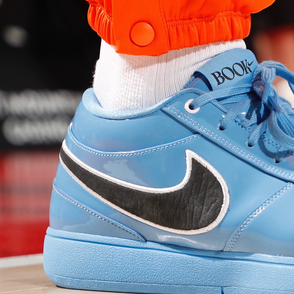 在赛前热身时,鞋王再次展现自己的实力,上脚从未见过的 Book 1 PE 配色。