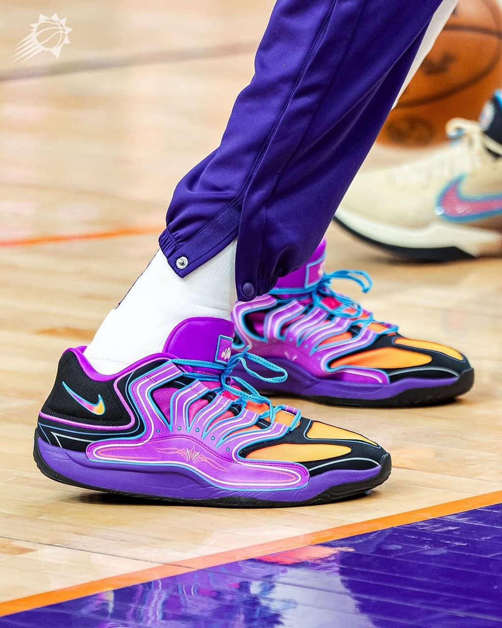 最近太阳队总算好起来了,接连战胜对手,重新杀入附加赛区。 在太阳对阵雄鹿的比赛中,杜兰特上脚了此前从未见过的 KD18 新配色。 灵感源自太阳队的城市版球衣,呈现亚利桑那州标志性的峡谷风光。 目前,Nike KD18 也曝光了不少配色了,但这双无论从细节设计还是色彩丰富度上,都是独一档的存在。 甚至有些二次元涂装的味道在里面,吸睛又骚气。 不过目前尚未释出市售消息,各位不妨保持期待。 Pic via:suns