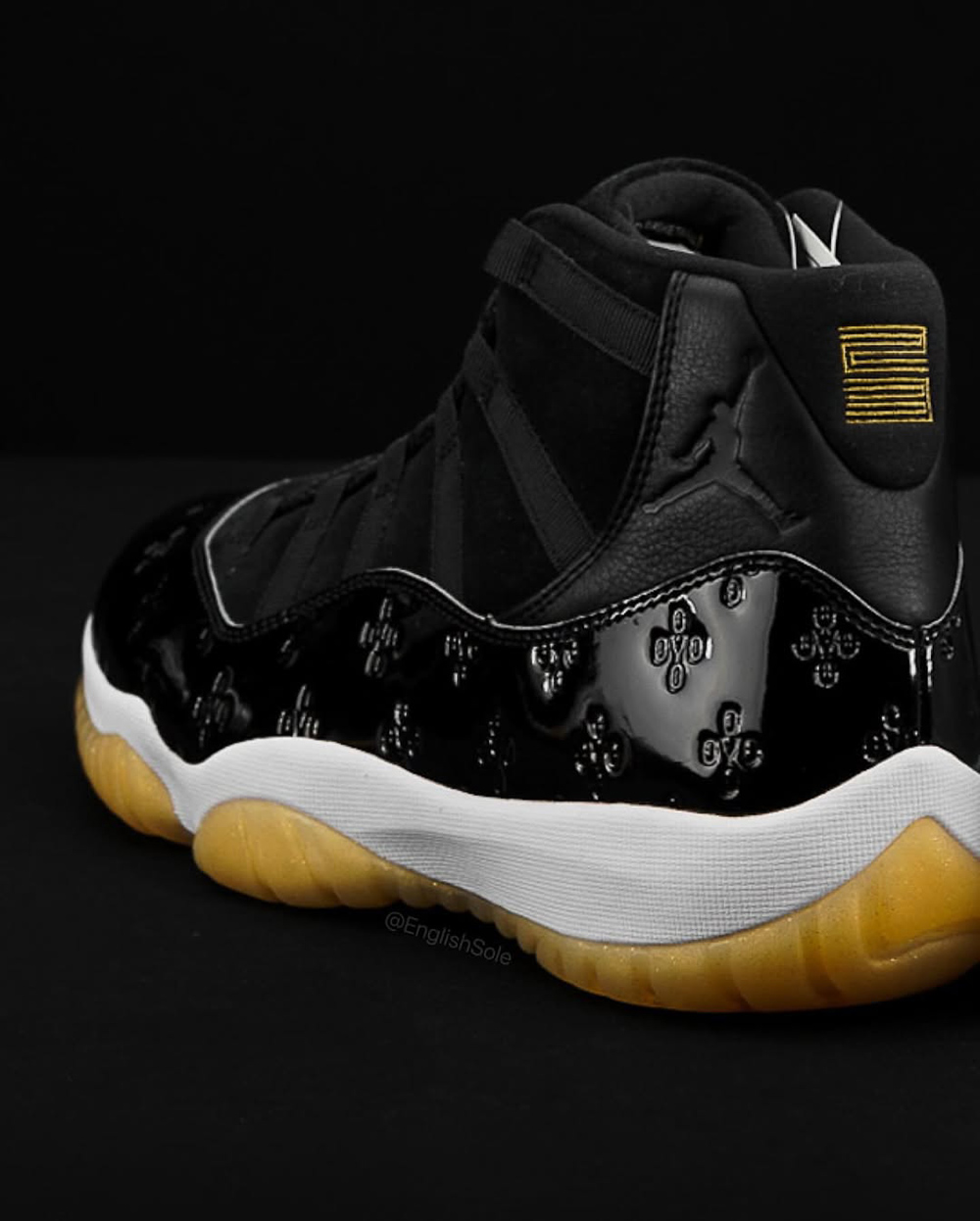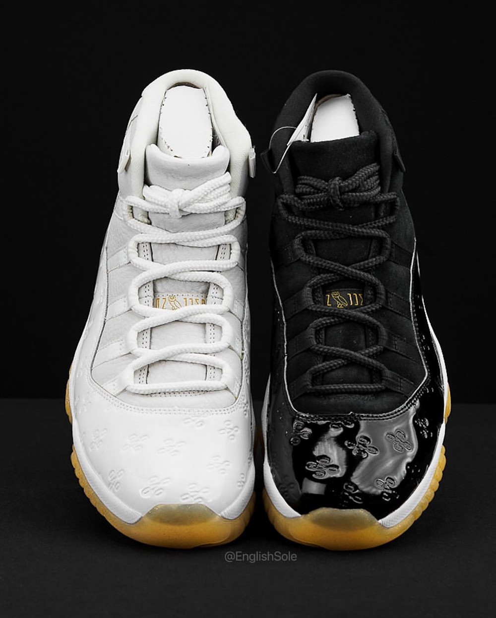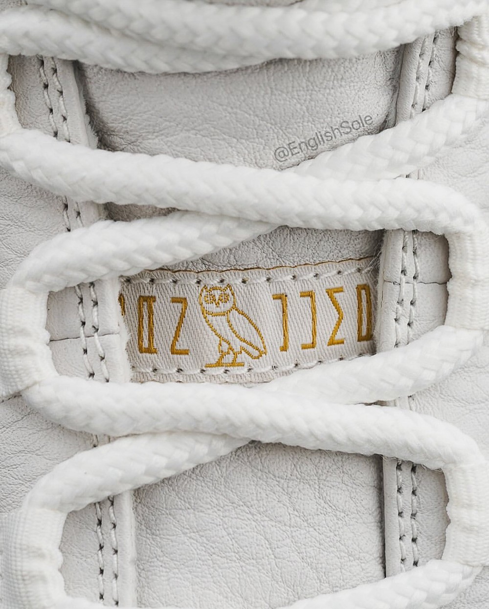 细看鞋舌 AJ11 独特的 JUMPMAN 字体中间,还点缀了 OVO 的猫头鹰 Logo,凸显独一无二的专属身份。