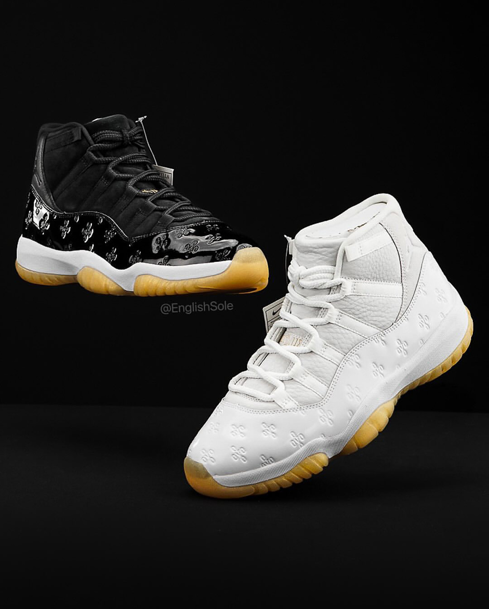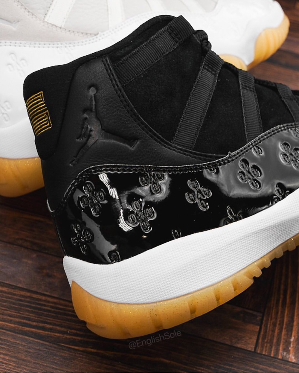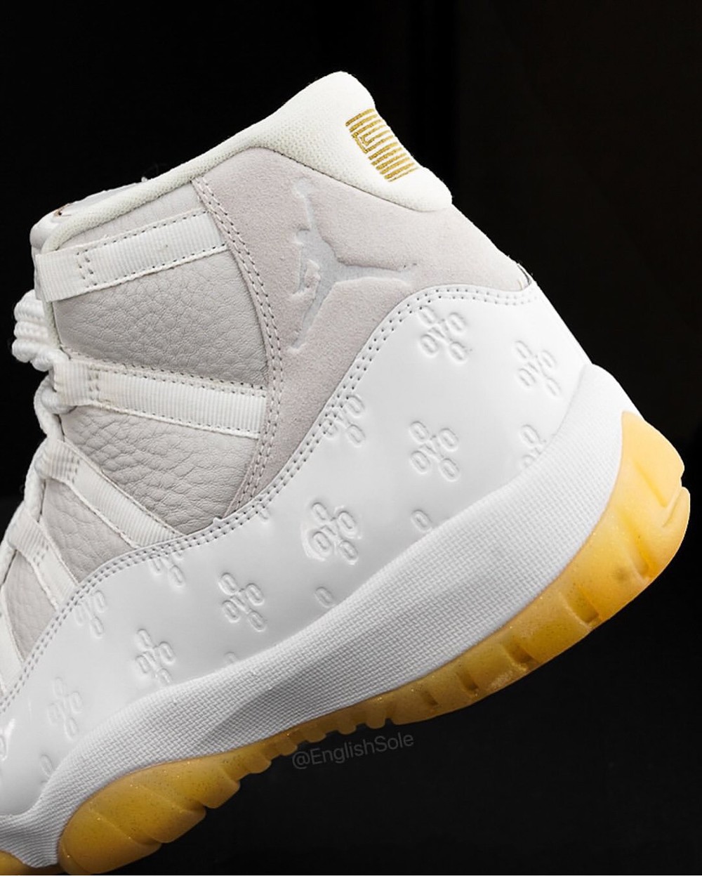 细看鞋舌 AJ11 独特的 JUMPMAN 字体中间,还点缀了 OVO 的猫头鹰 Logo,凸显独一无二的专属身份。