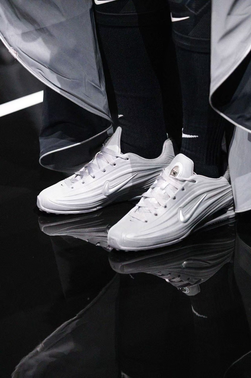 整体采用一席银灰搭配鞋面立体浮雕线条示人,延续 Shox 一贯的前卫科幻基因。