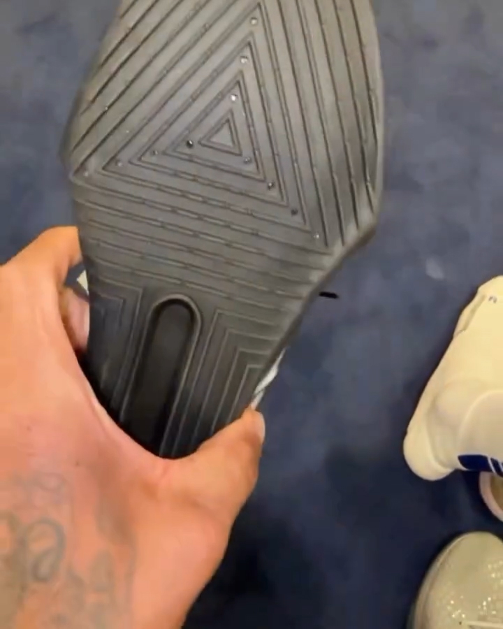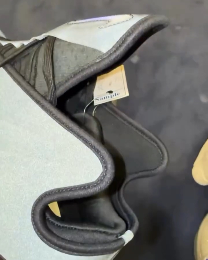 从目前的视频截图来看,鞋身还挂着 Sample 字样的标签,并且外底轮廓也进一步看清了。