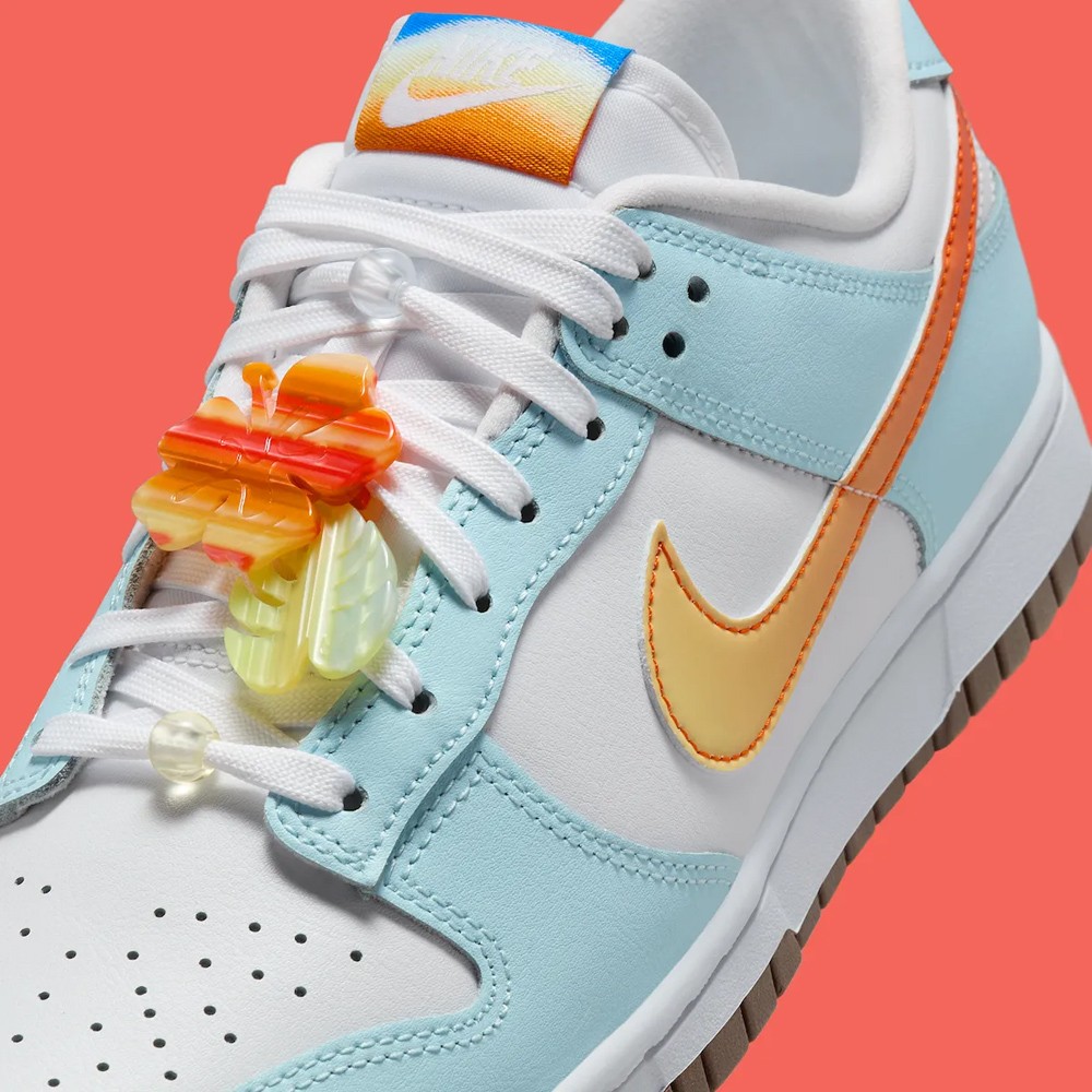 另一款 Dunk Low 则通过冰川蓝与白色构建鞋身,同样加入了可爱的鞋带扣元素,营造清爽俏皮的假日气氛。