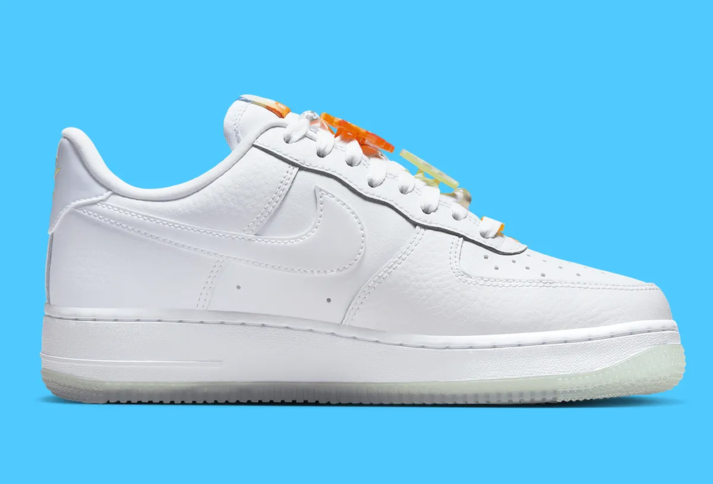首先 Air Force 1 Low 采用熟悉的一席白色为底,鞋带扣加入棕榈树、鲜花与珍珠点缀,除此之外,鞋舌标签还装饰有海边日落图案,进一步烘托主题。