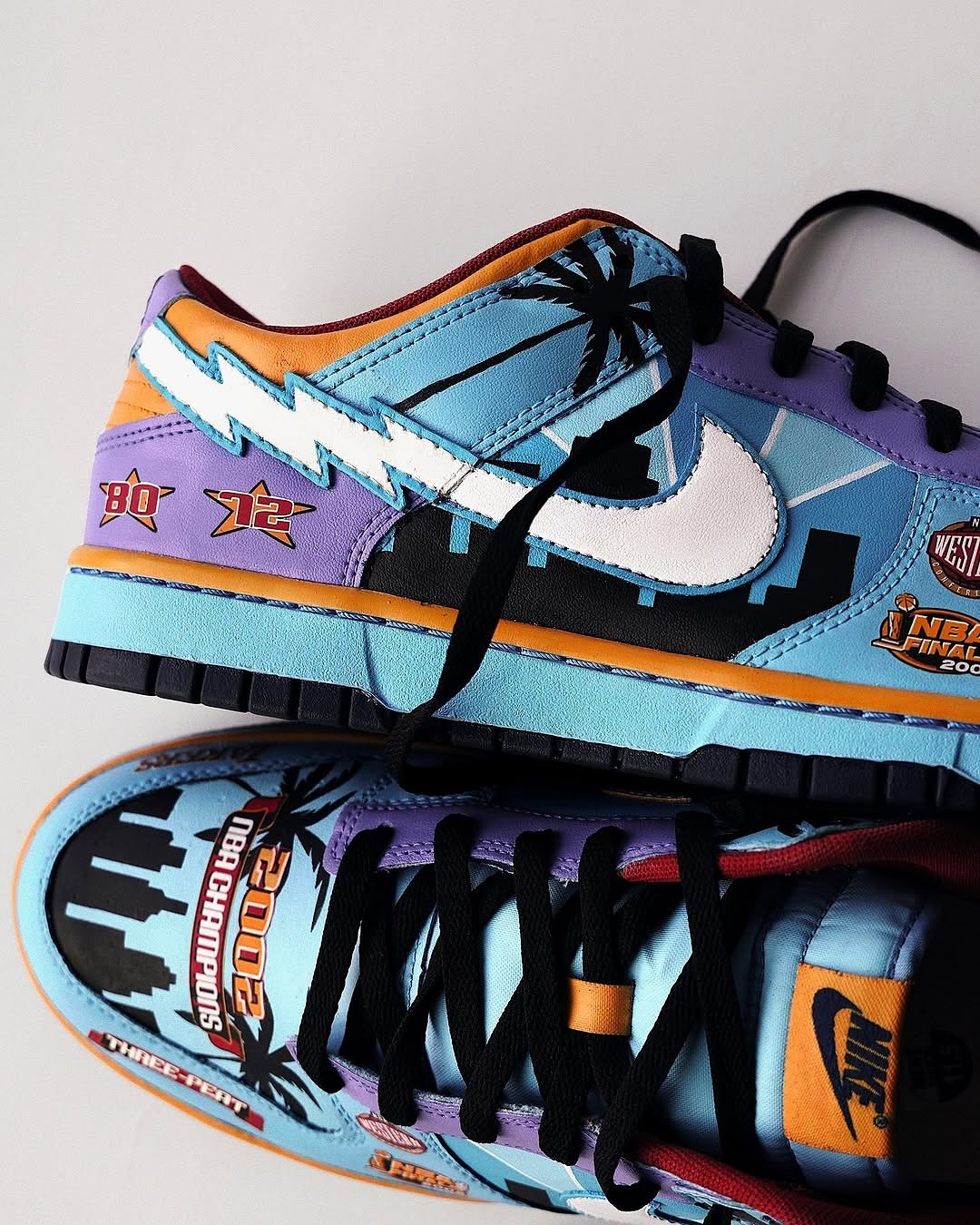 这件专属定制的皮衣不仅直击主题,呈现了 2002 湖人总冠军、三连冠等字样,还展现了洛杉矶城市天际线和棕榈树等丰富的视觉元素,加上对于色调的精准把控,使其成为了一件独一无二的艺术品。