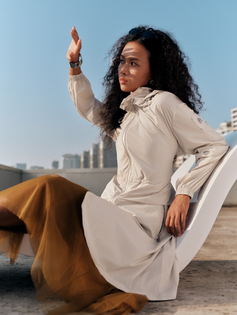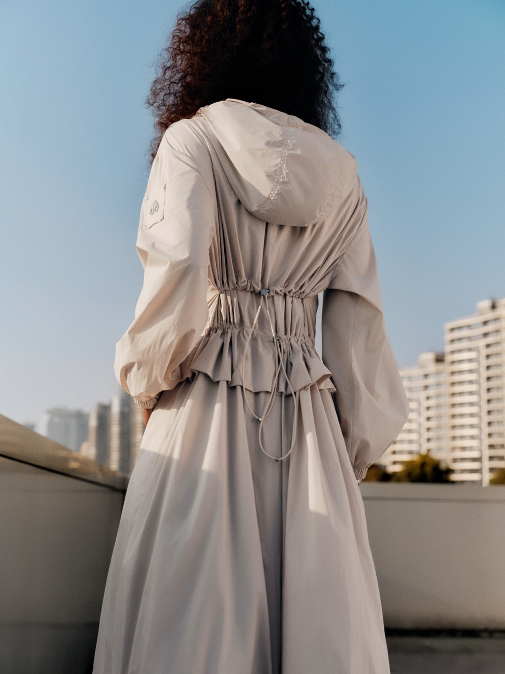 而 RACHELLE 防晒夹克则以超长风衣造型给予全方位防护体验,可调连帽设计适配多元场景。