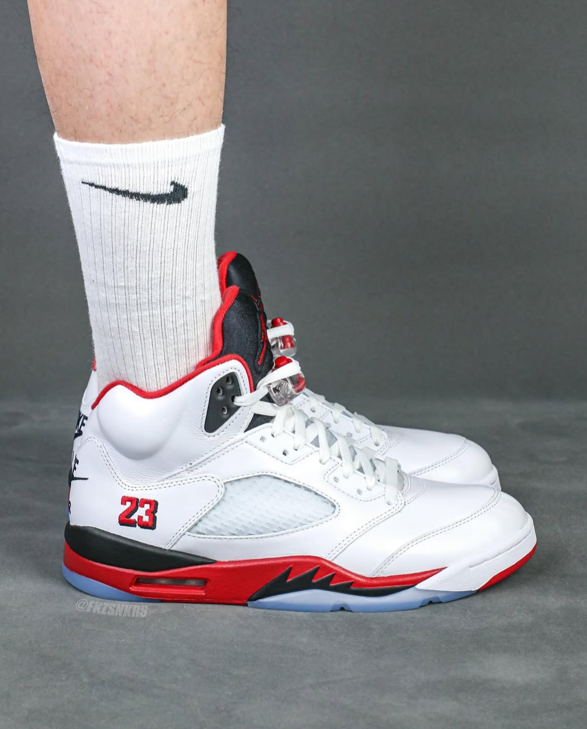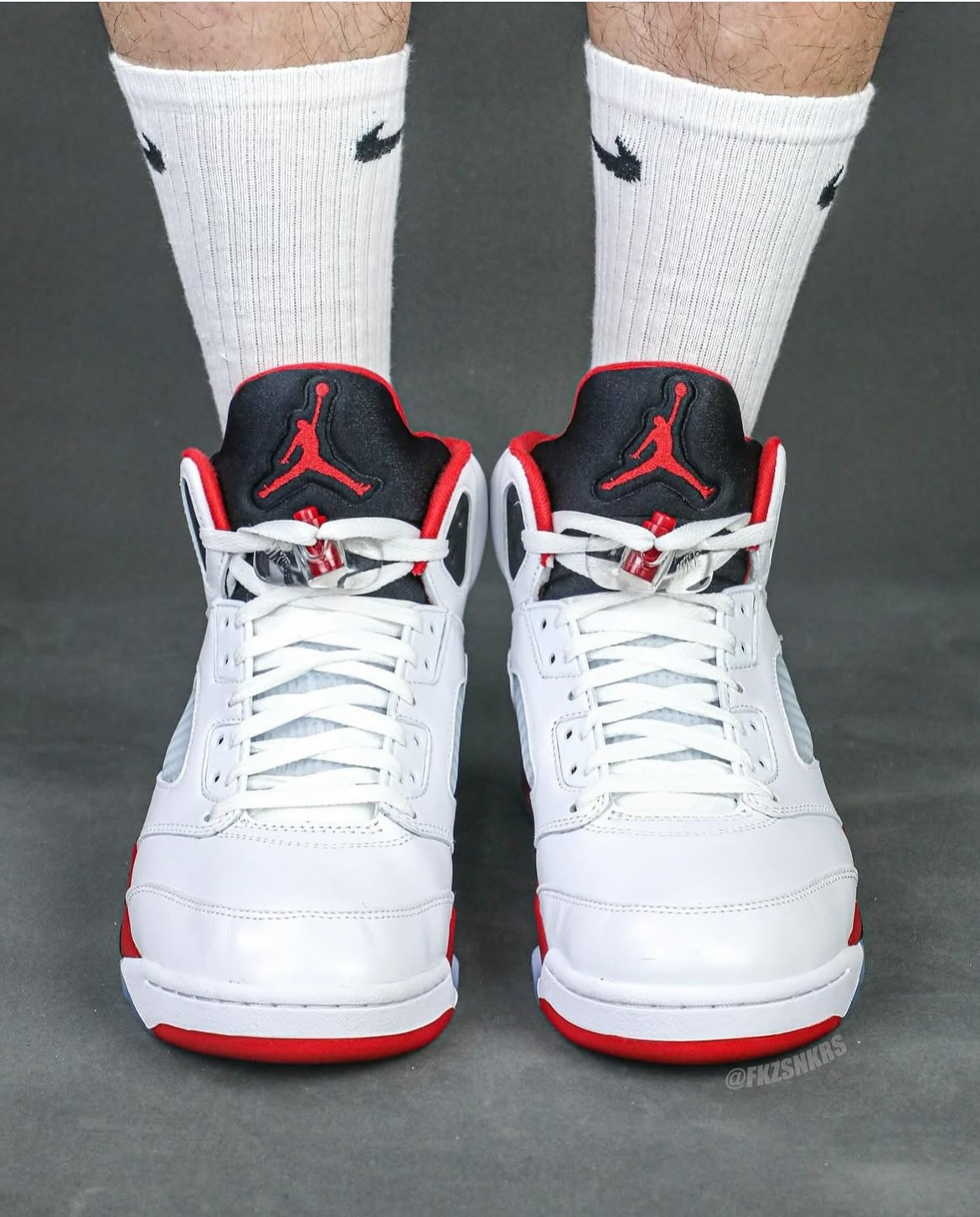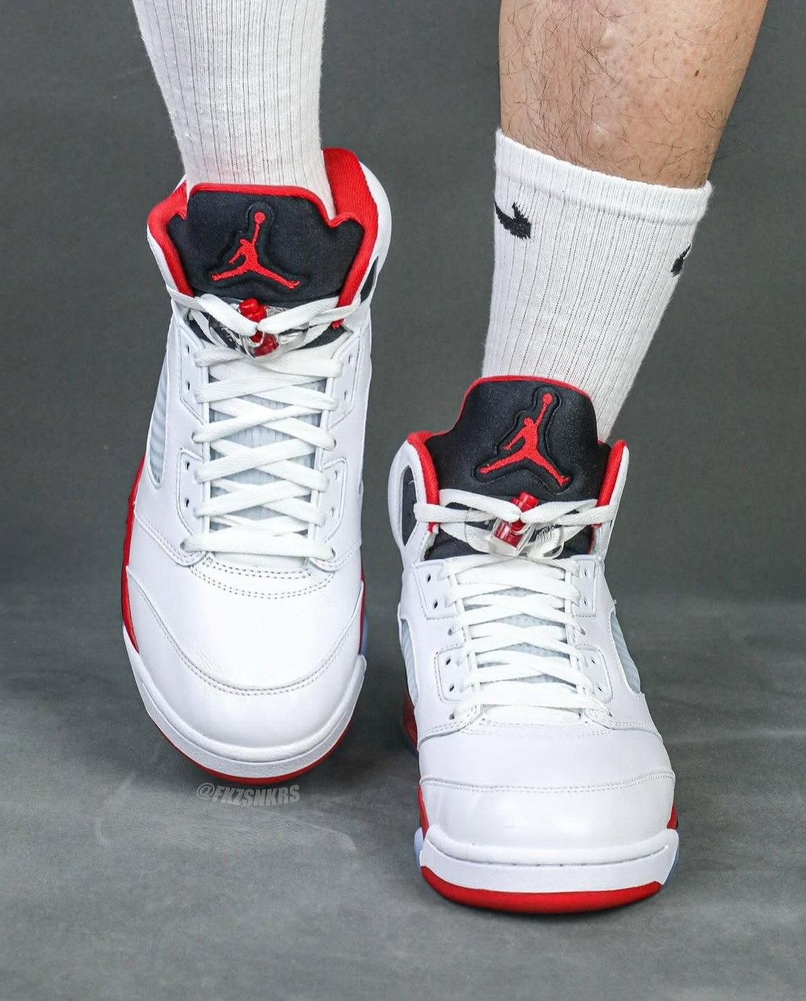 作为元年配色之一的黑鞋舌版本 Air Jordan 5 “Fire Red Black Tongue” 迎来一组上脚图。