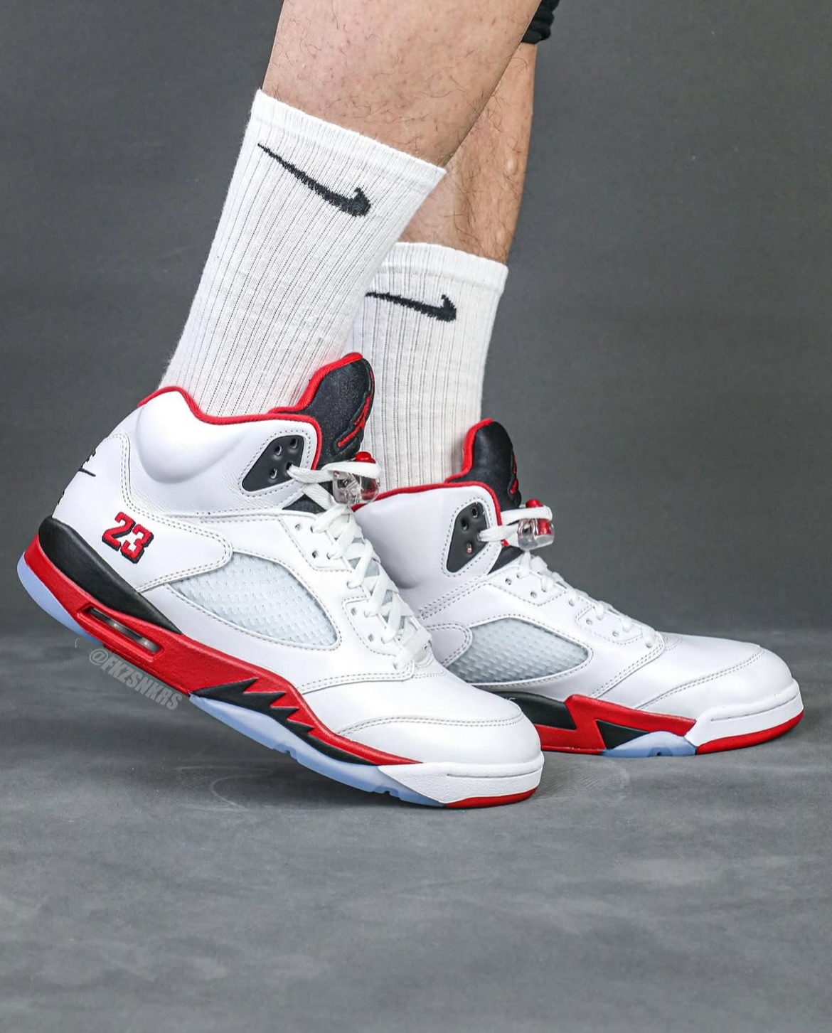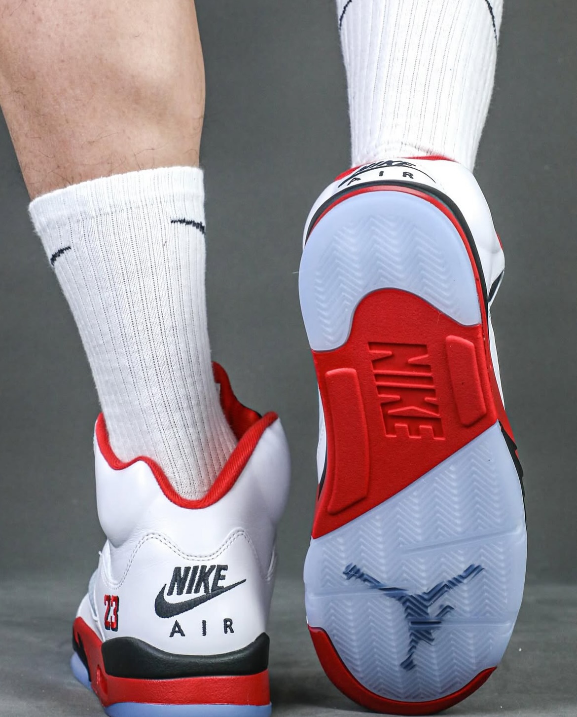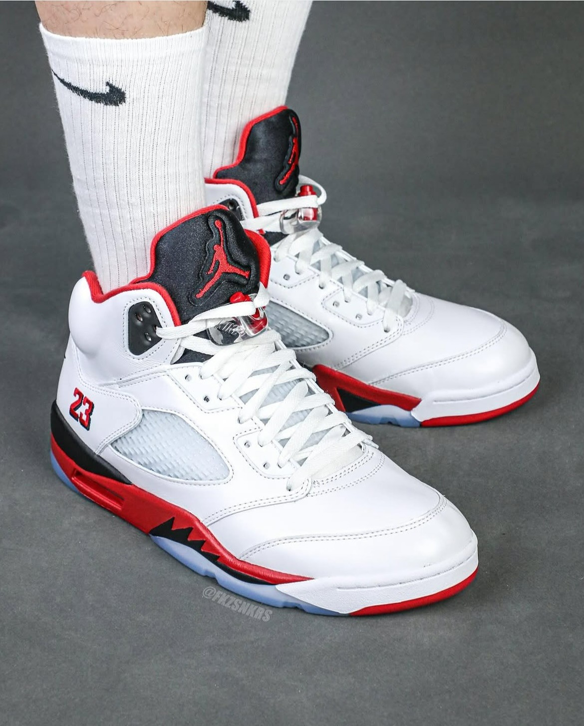 作为元年配色之一的黑鞋舌版本 Air Jordan 5 “Fire Red Black Tongue” 迎来一组上脚图。
