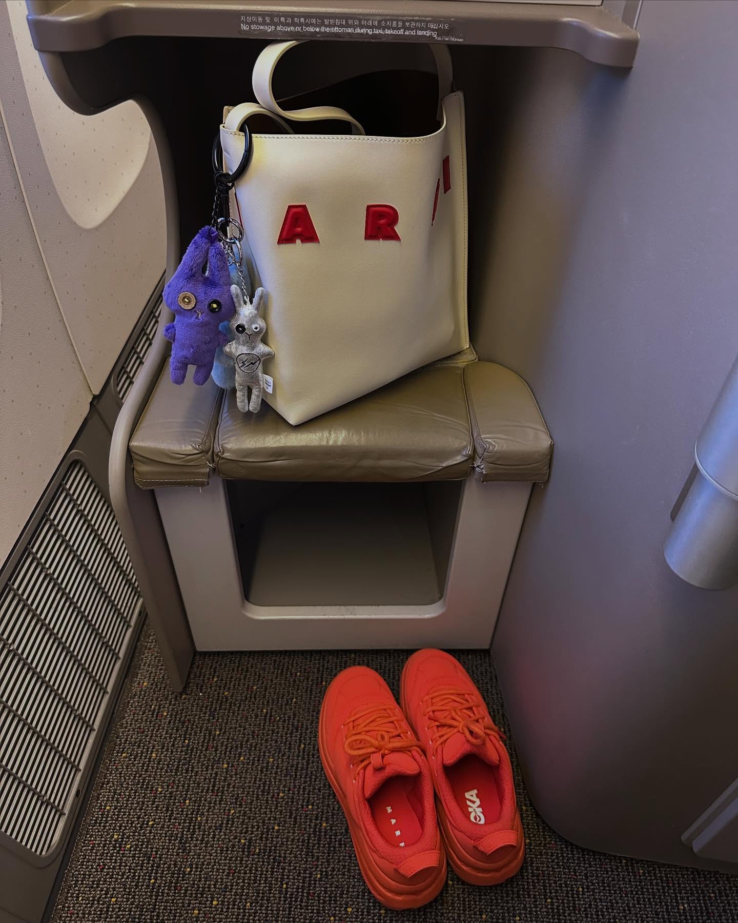 朴山多拉又开始了机场晒鞋日常,这次穿的是 Marni x HOKA Bondi B3LS。