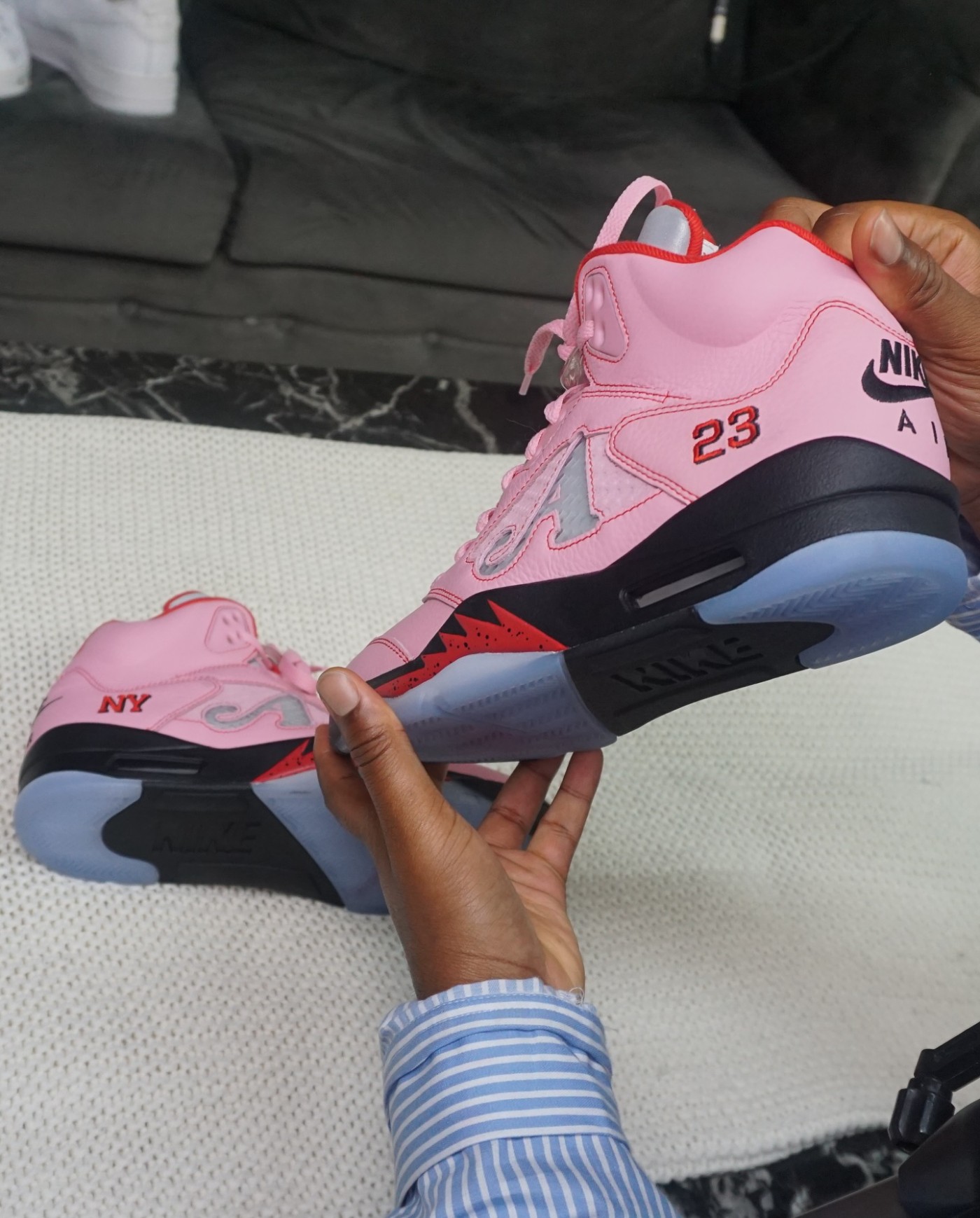 此次合作不仅延续 Air Jordan 5 经典轮廓,更以 1990 年 OG「Fire Red」配色为基底注入纽约街头基因。