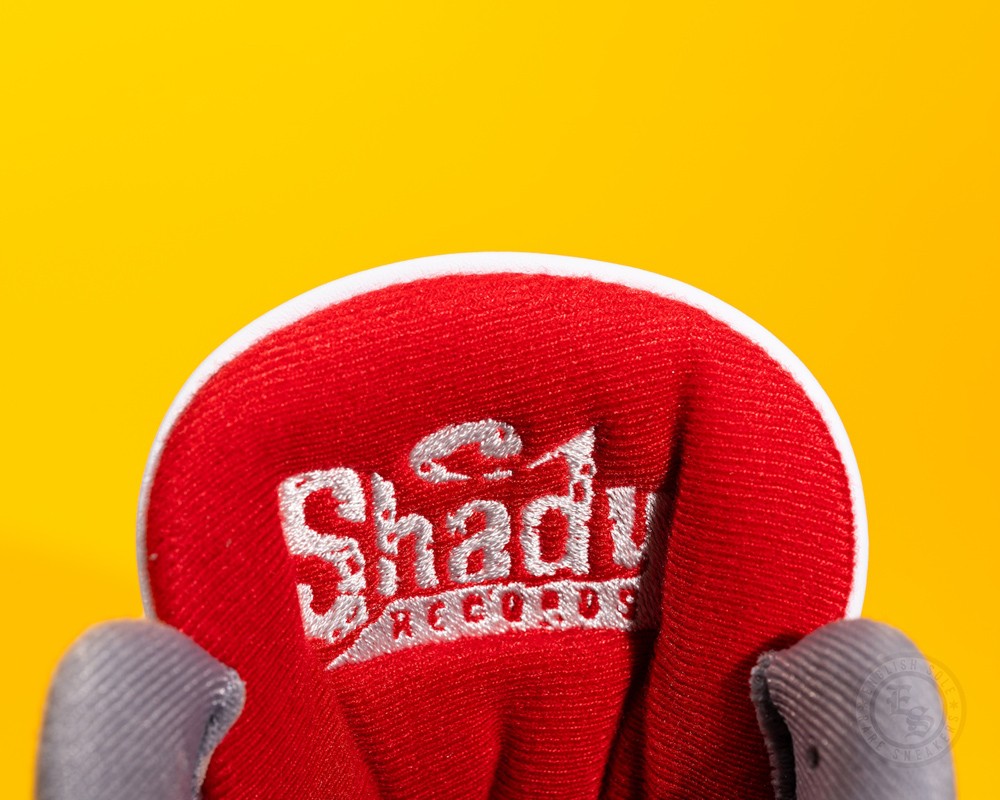 首先,最醒目的则是鞋舌硕大的反 “E” Logo,鞋舌内侧分别加入厂牌 Shady Record 及经典面具刺绣,后跟处的 “HI!MY NAME IS SLAM SHADY” 图标代替 Jumpman Logo,鞋垫还印有 Eminem 字样,突显鞋款独有身份。