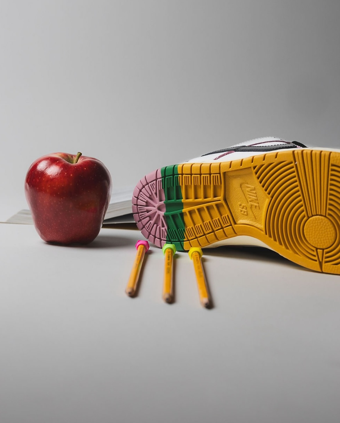 这组照片拍的也是相当有氛围感,用学生时期常见的铅笔、书本当道具,进一步凸显鞋款主题。