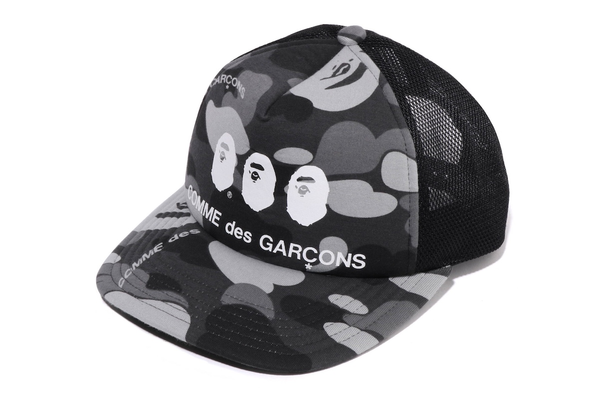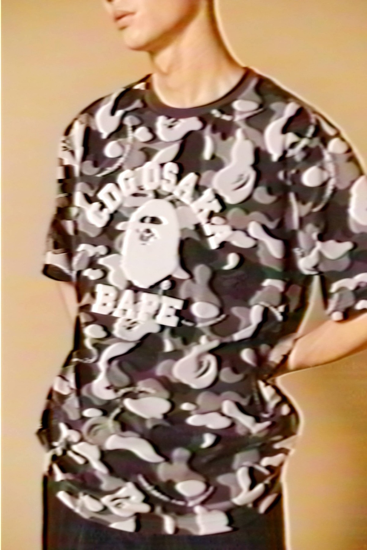 至于服饰的设计,可以看到 BAPE 看家的迷彩元素,以及 CDG OSAKA Logo。