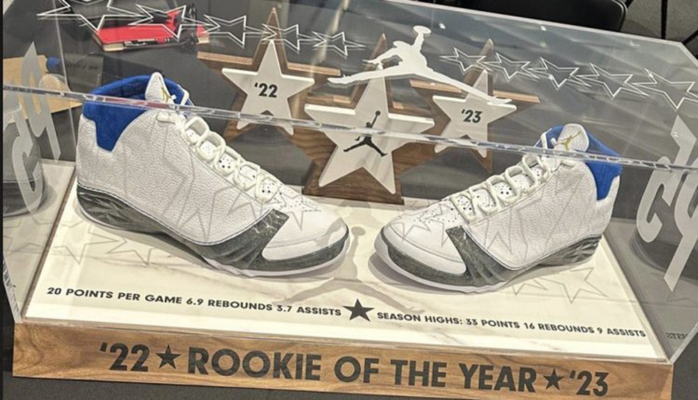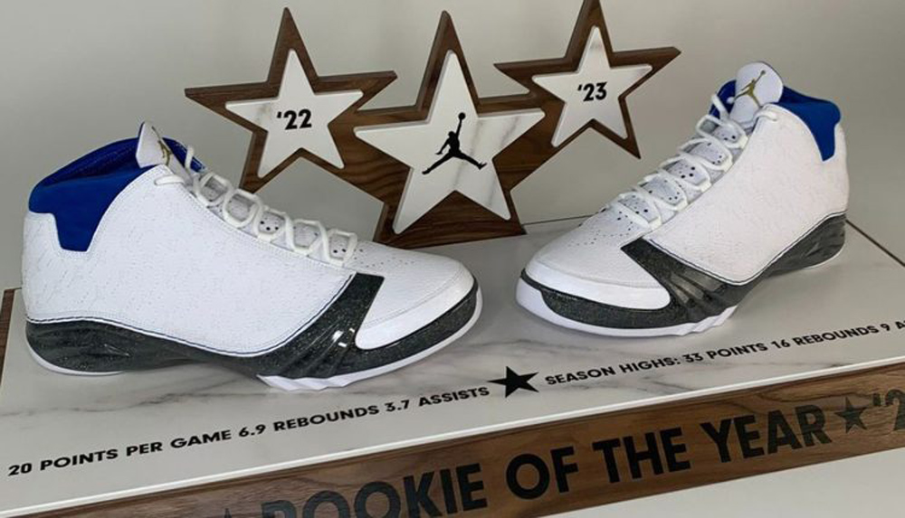 赛场上脚 AJ PE 接连不断,还在 22-23 赛季荣获最佳新秀后,收到 Jordan Brand 的特殊大礼。
