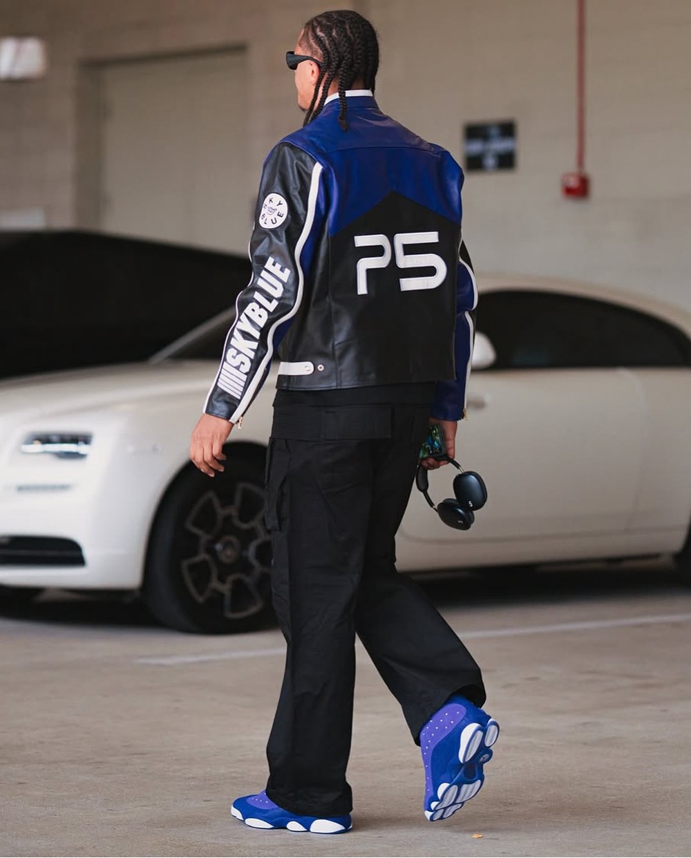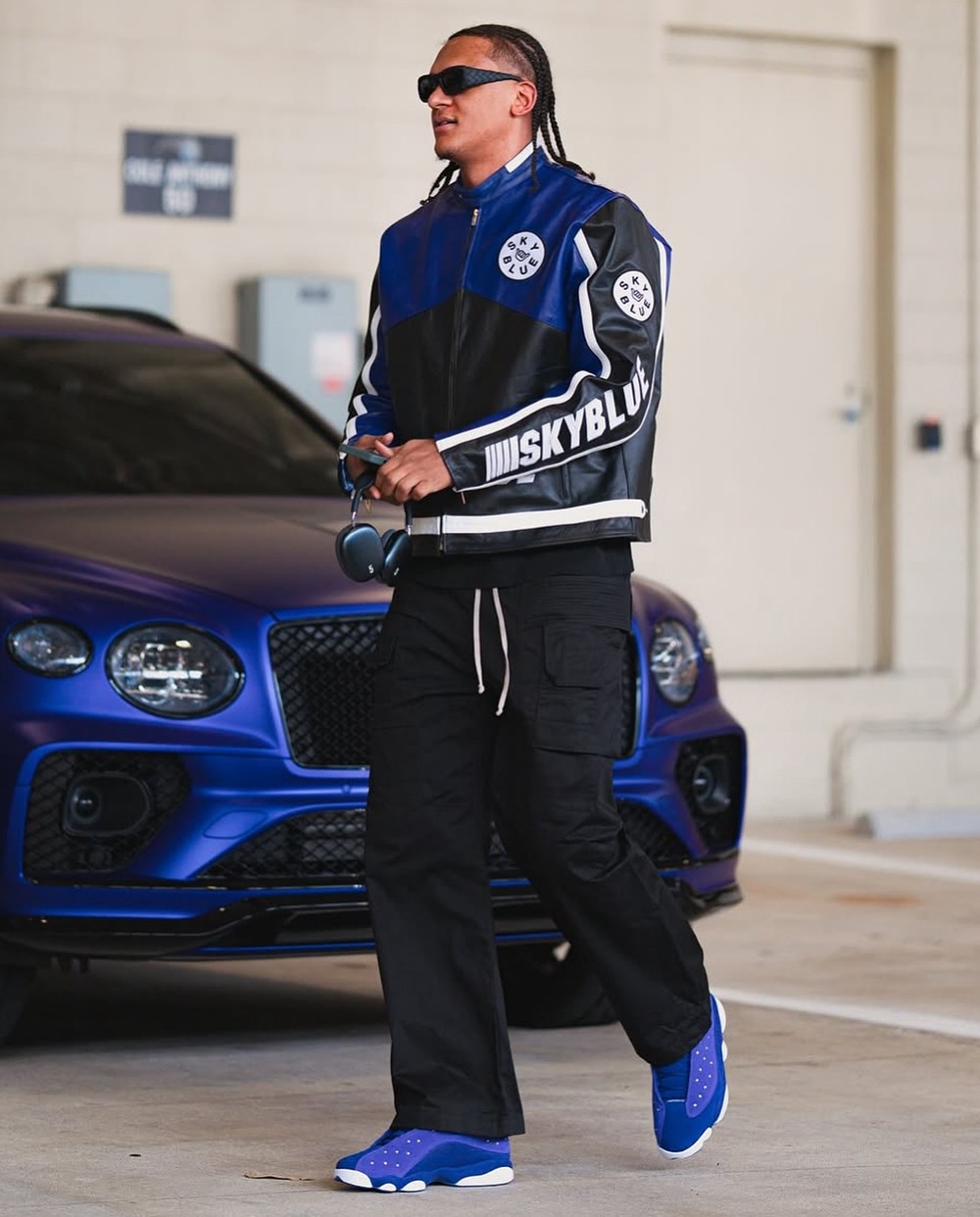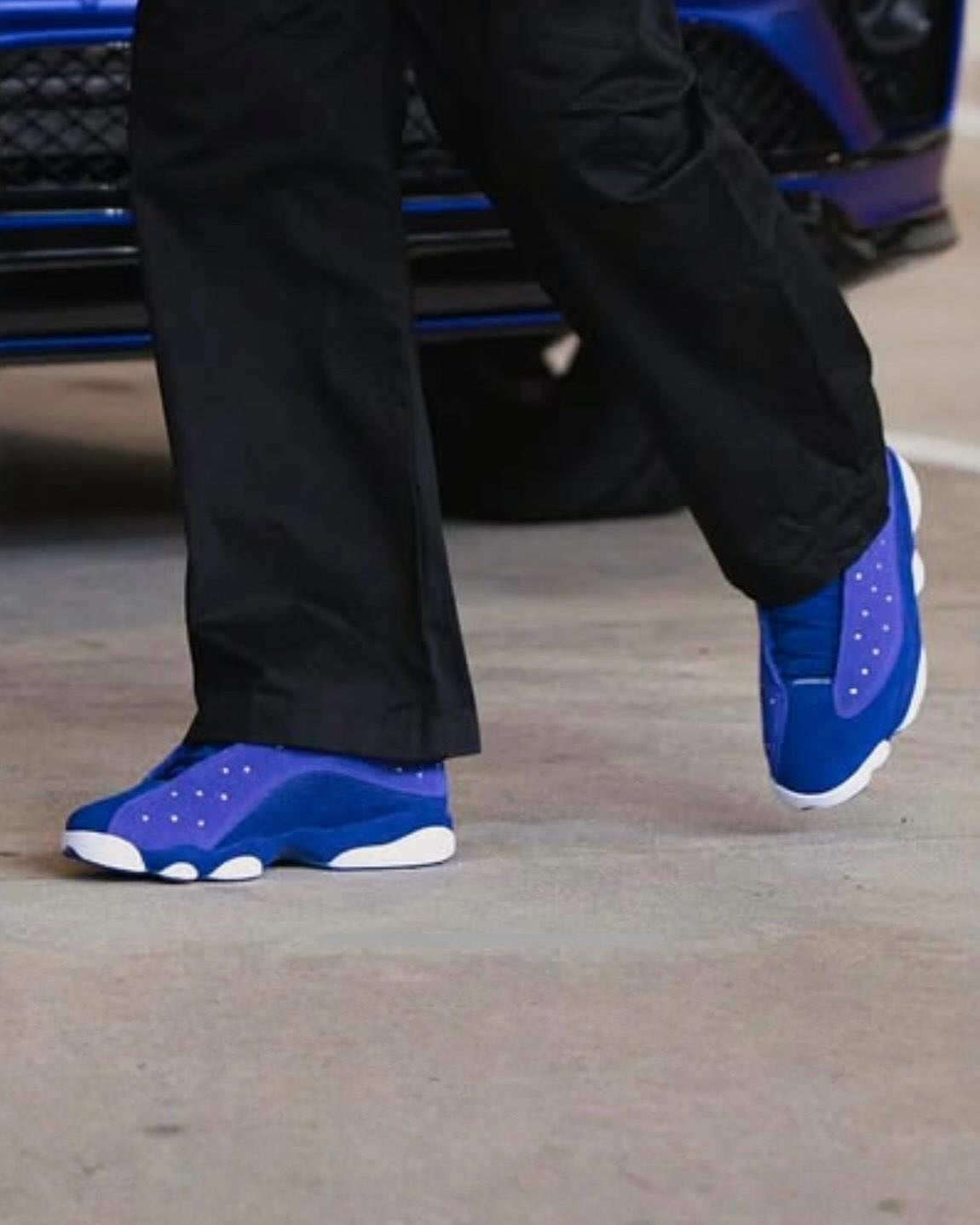 全蓝色鞋面衬托紫色皮革,加之 AJ13 独有的白色豹掌外底,与整体穿搭及身后的宾利跑车无比契合。