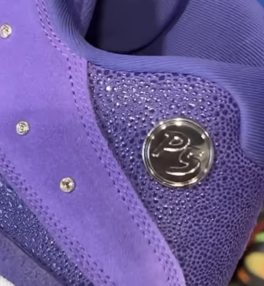 细看在后跟魔鬼鱼皮的衬托下,布满钻石的鞋侧,在后跟豹眼位置改以 P5 的个人 Logo 装饰。