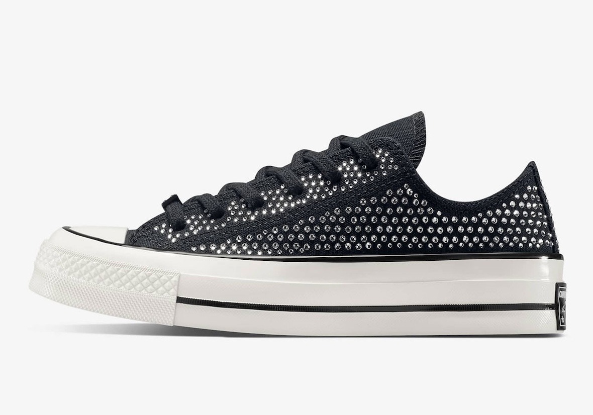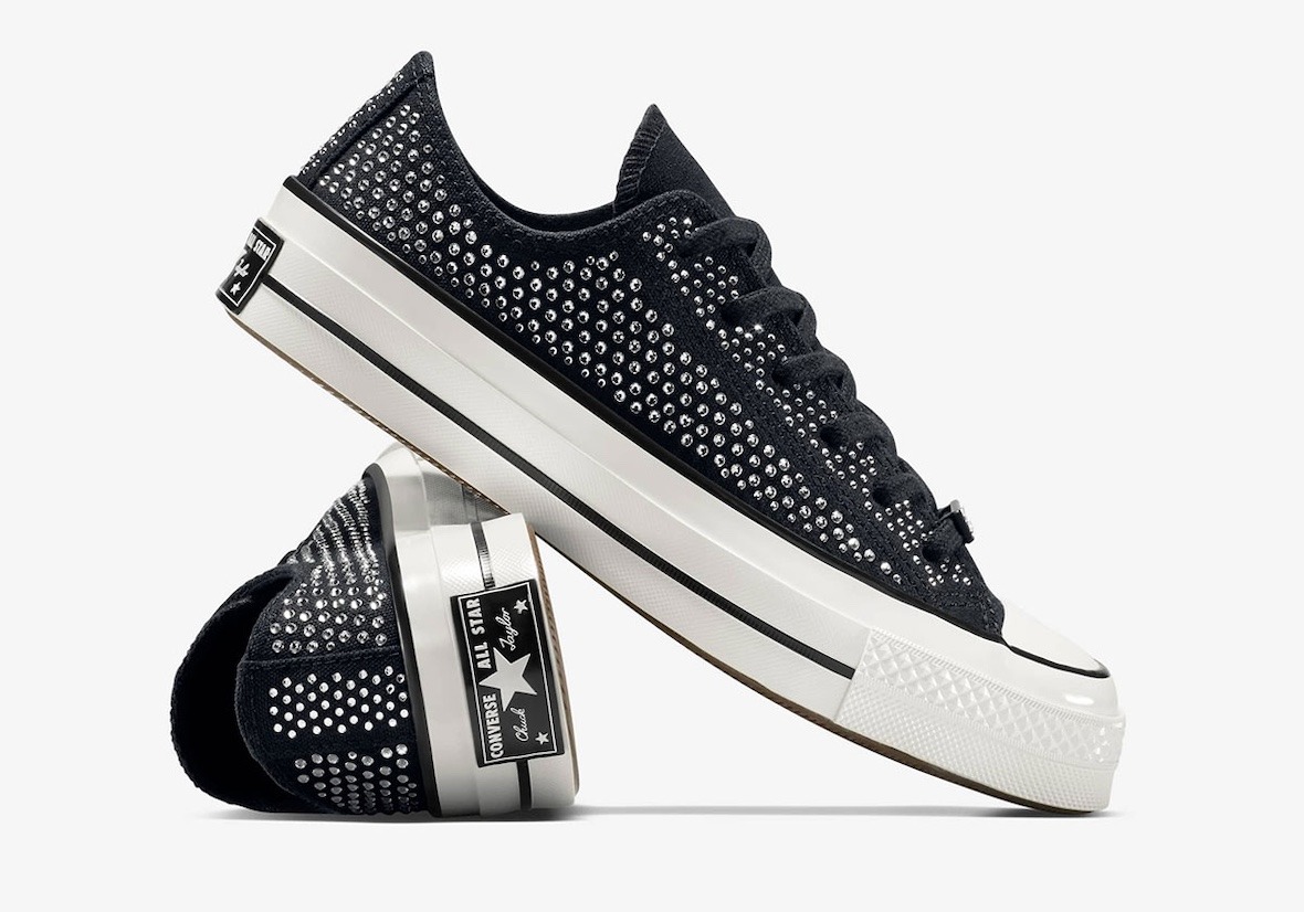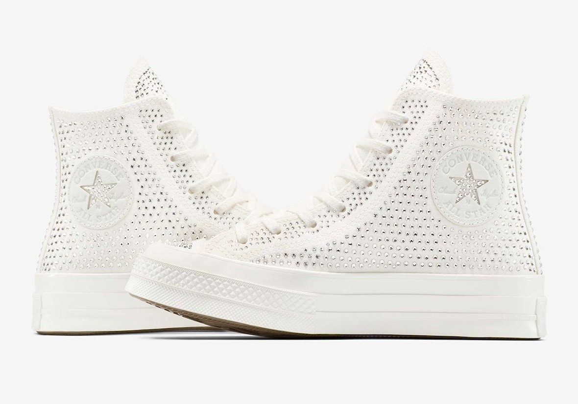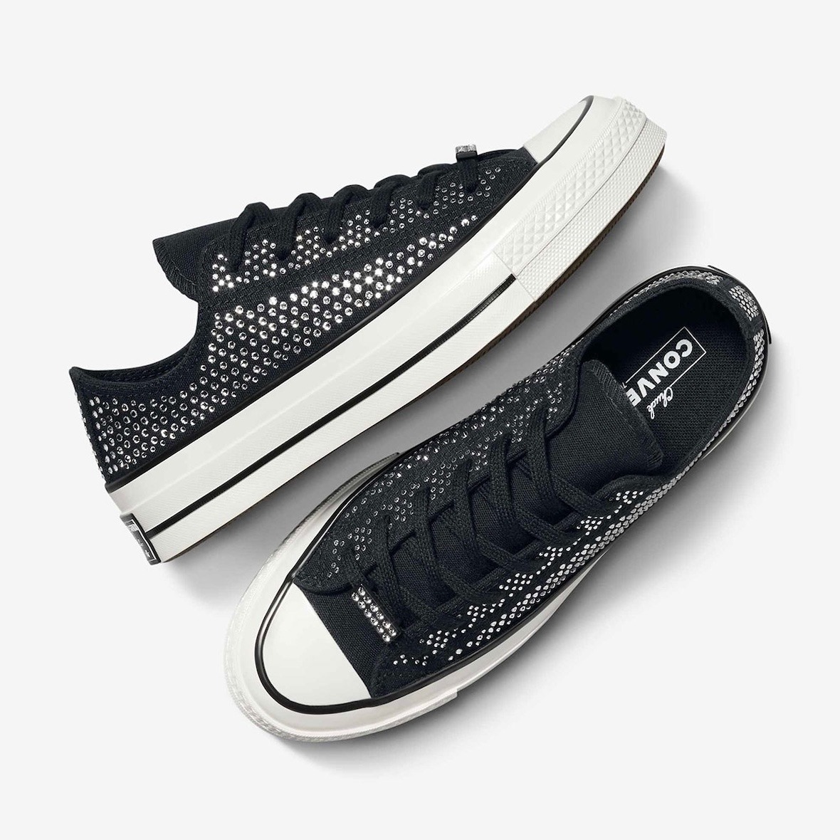 本次的 Swarovski x Converse Chuck 70 联名系列打造了一款高帮的白色配色和低帮的黑色配色。