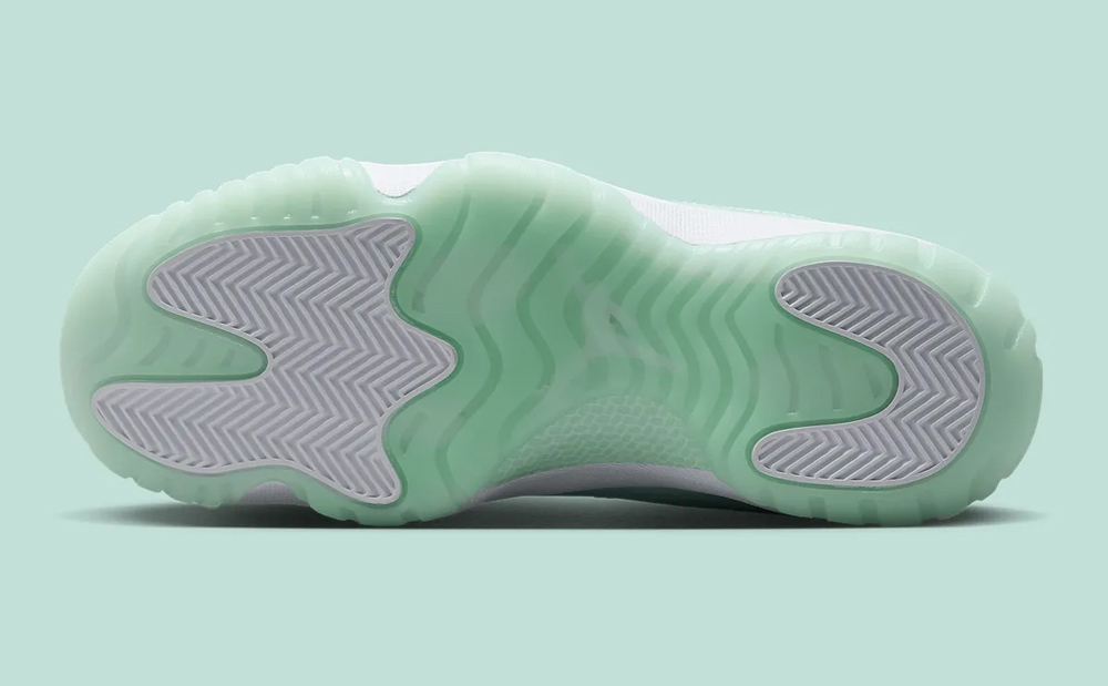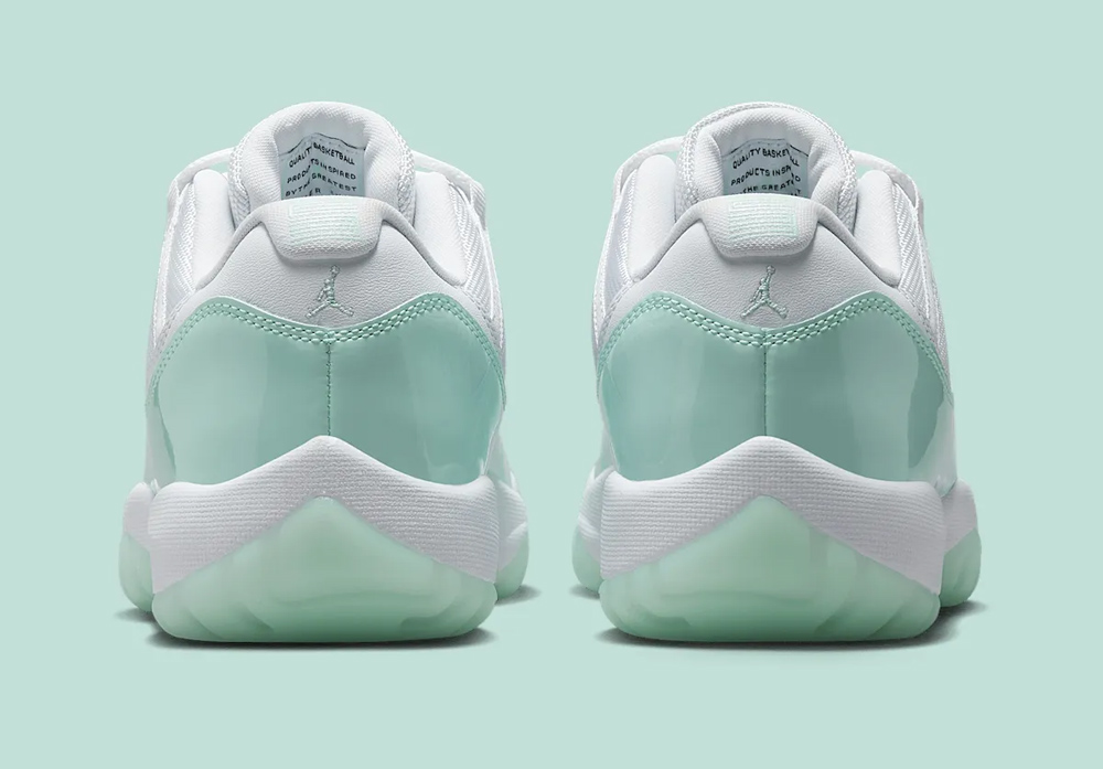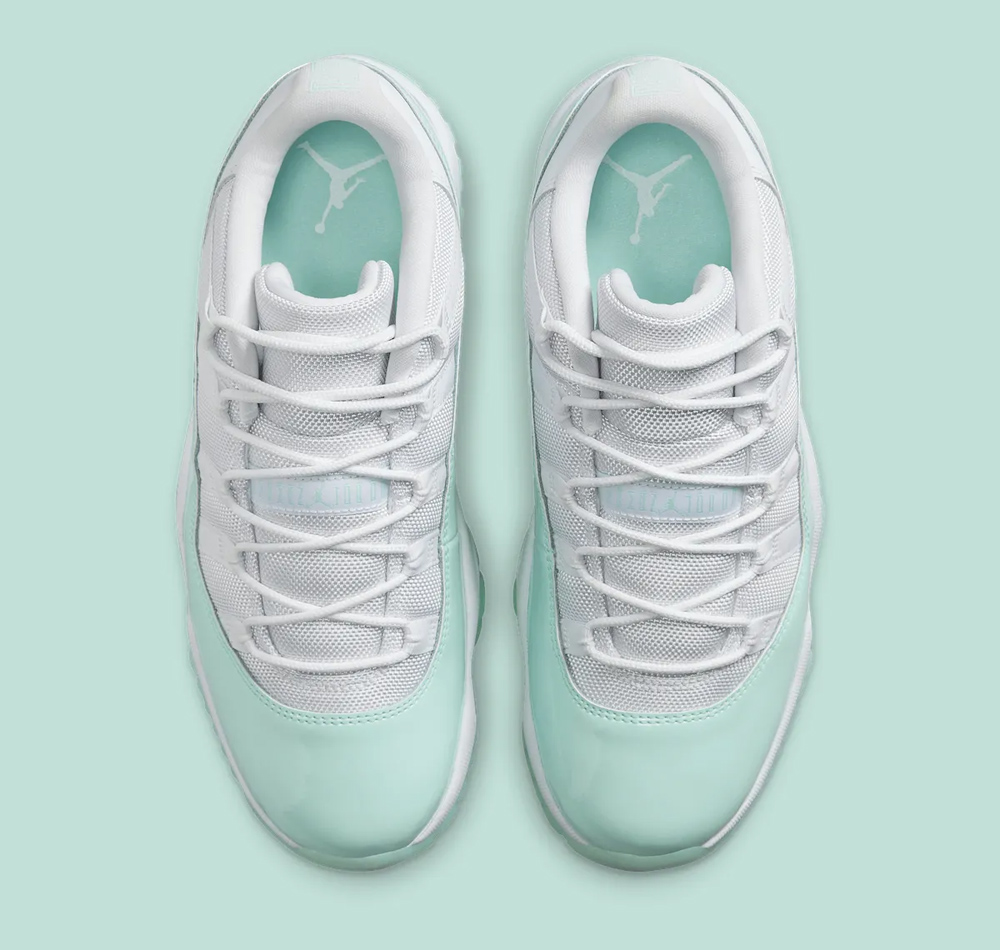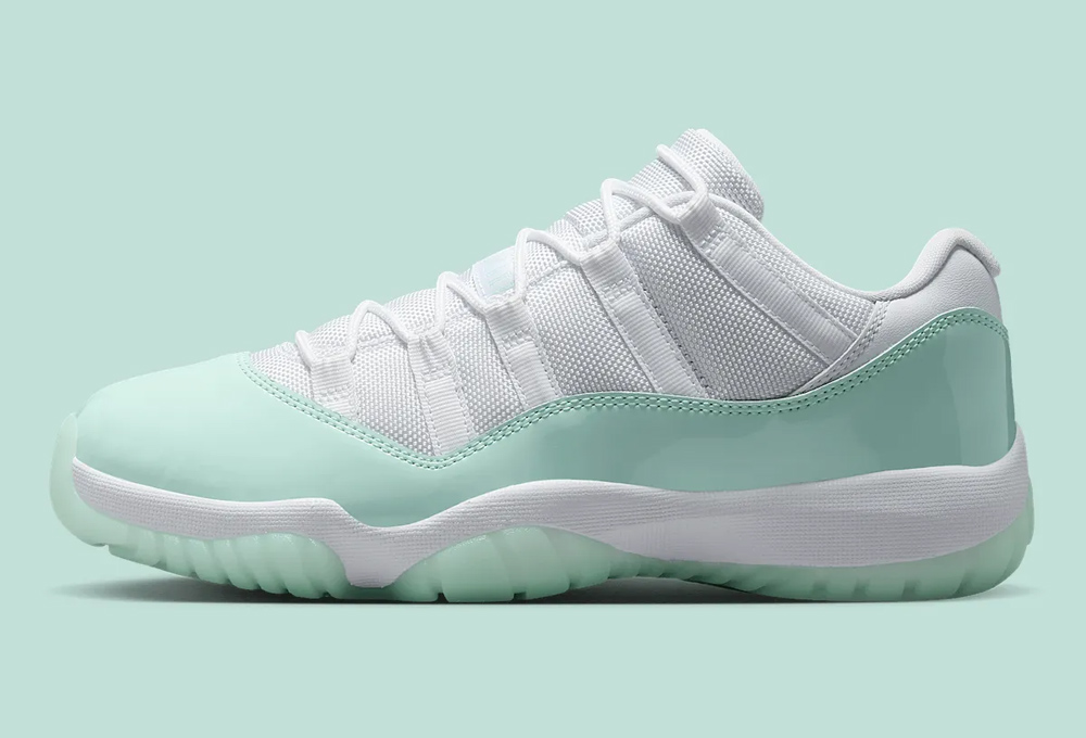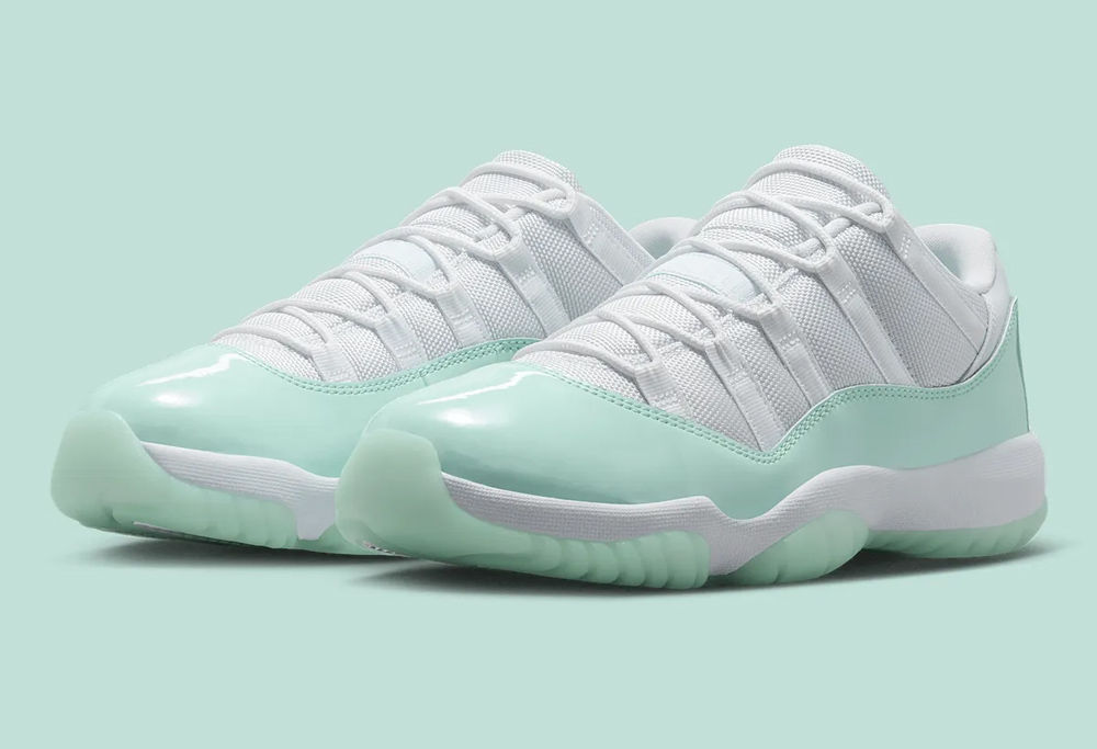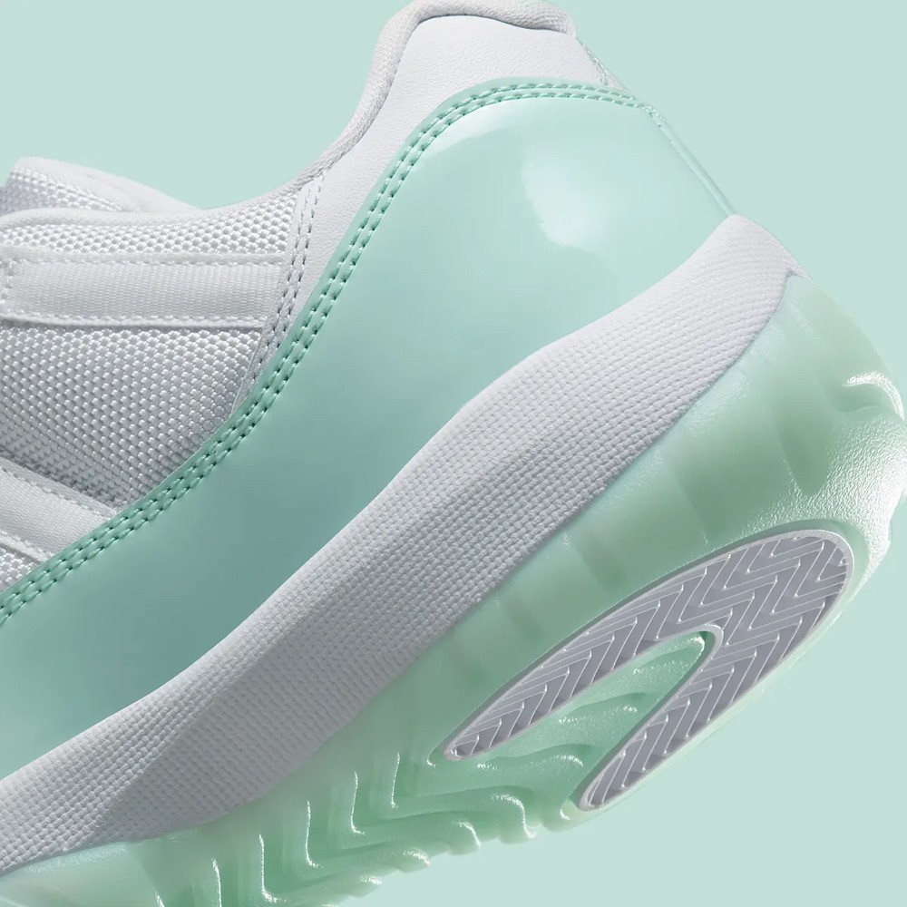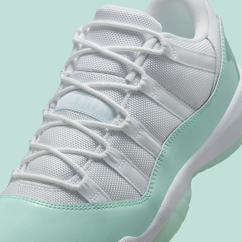 鞋身轮廓延续低帮 Air Jordan 11 Low 惯用的小漆皮设定,清爽的薄荷绿漆皮装扮,搭配经典的尼龙织物鞋面及冰绿果冻外底,营造出难以抗拒的冰凉感受,更加契合夏日的穿搭需求。