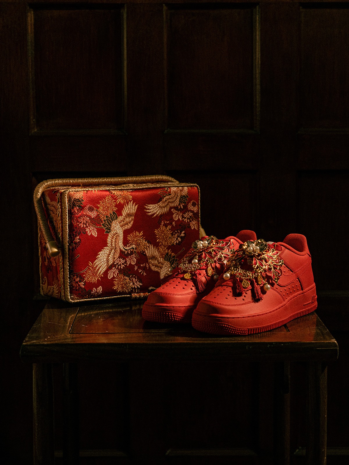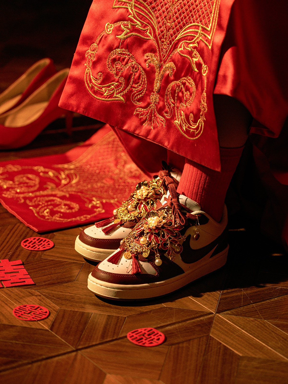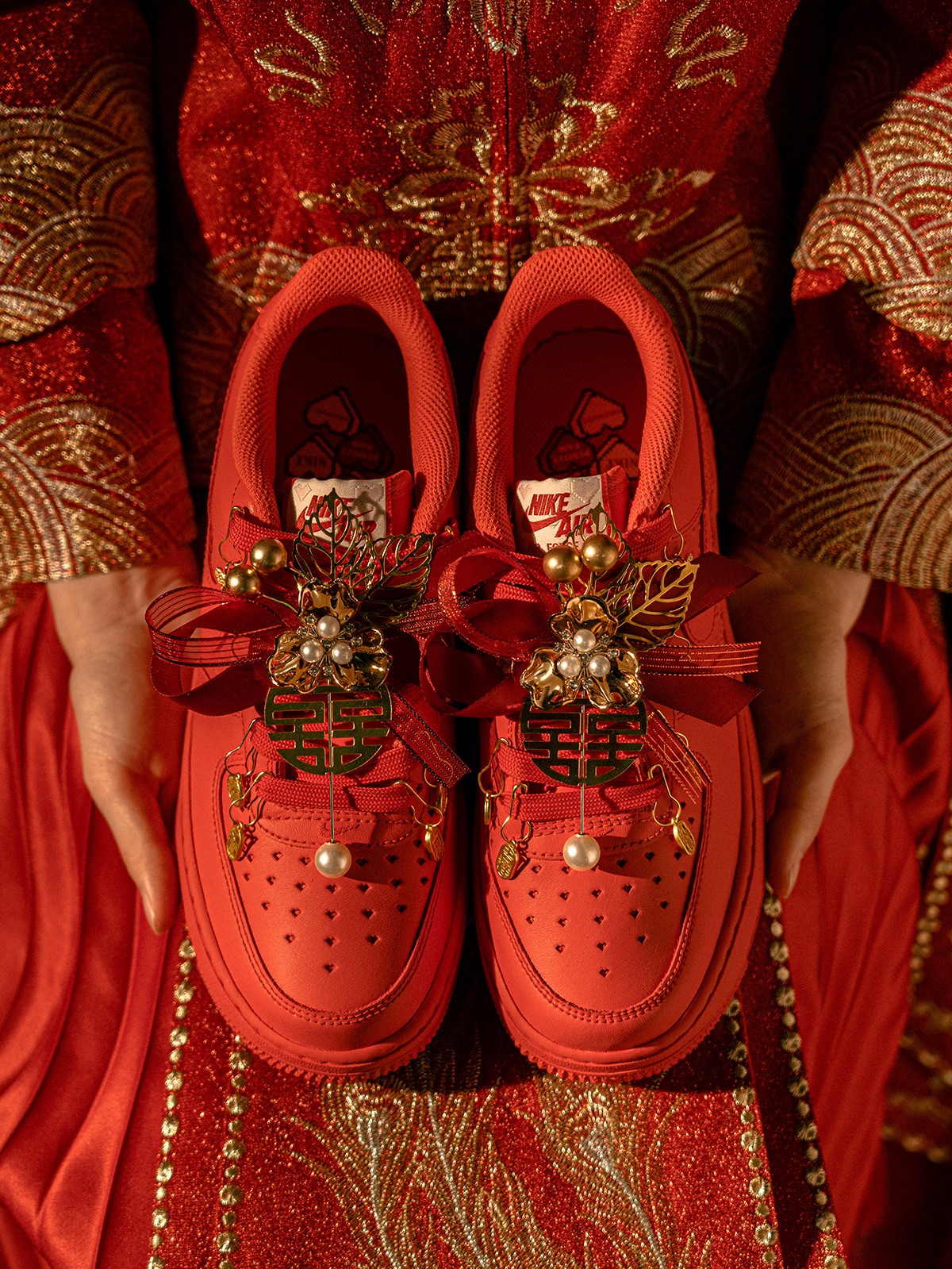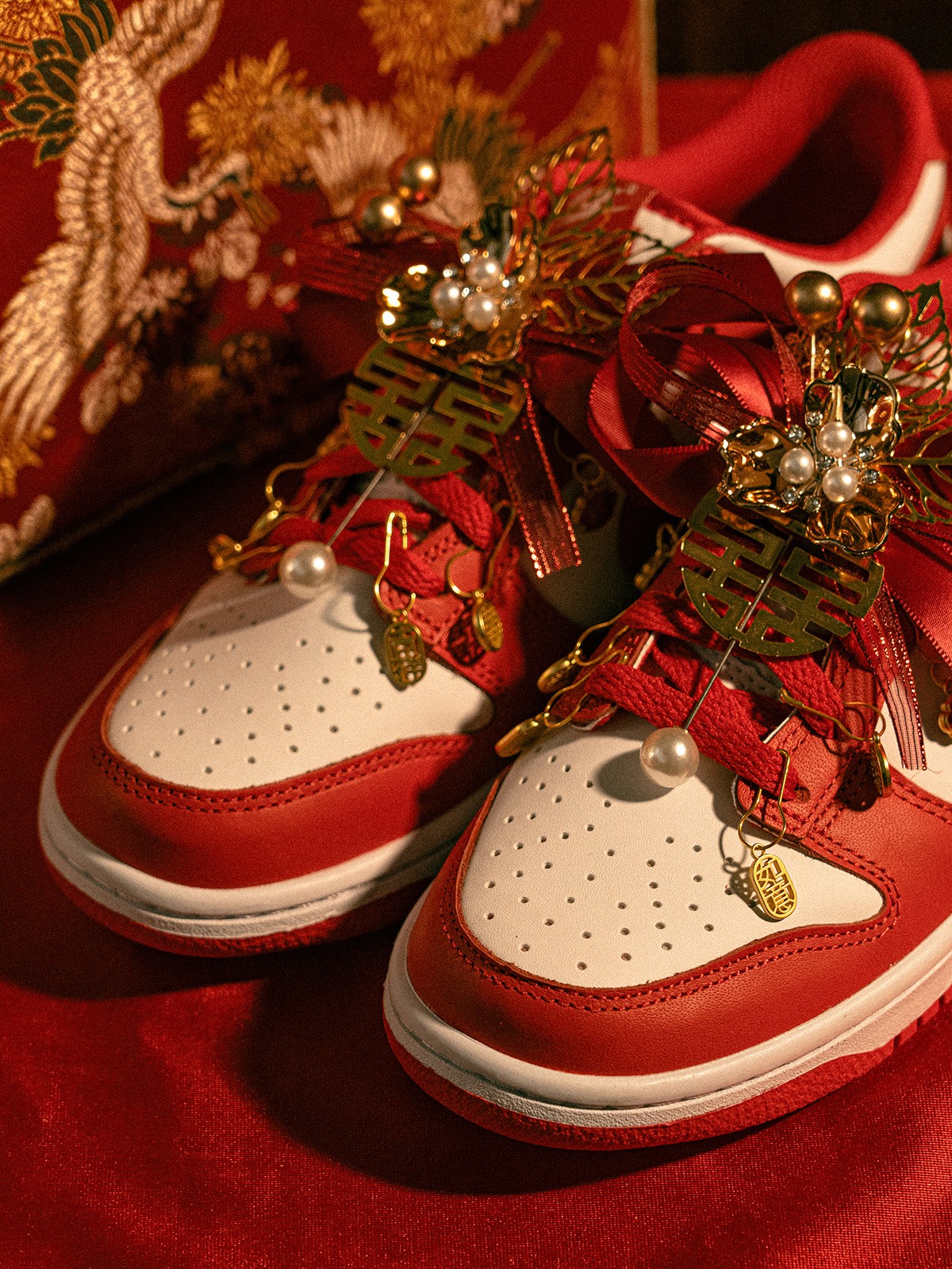 以「龙凤呈祥」为主题,这 4 款婚鞋分别采用了 Air Force 1、Air Jordan 1、Court 和 Dunk 鞋型为蓝本,带来红金色调的华丽喜庆效果。