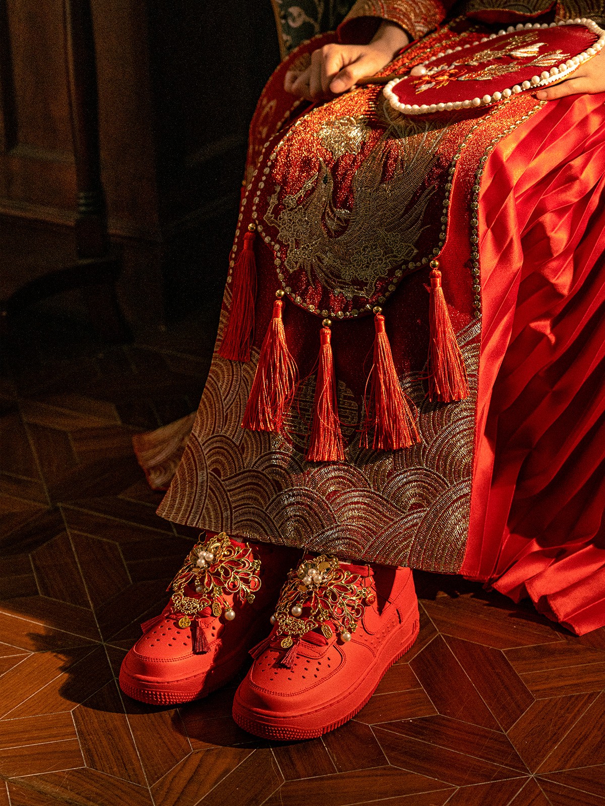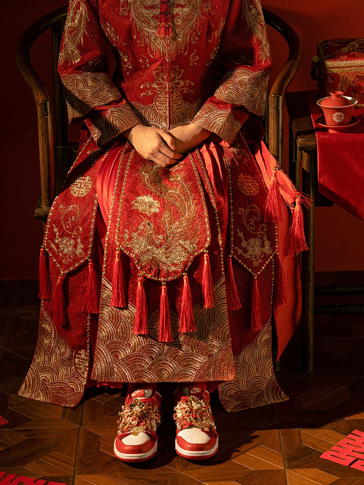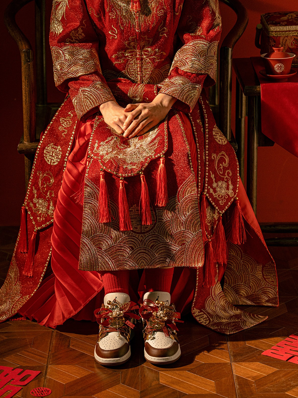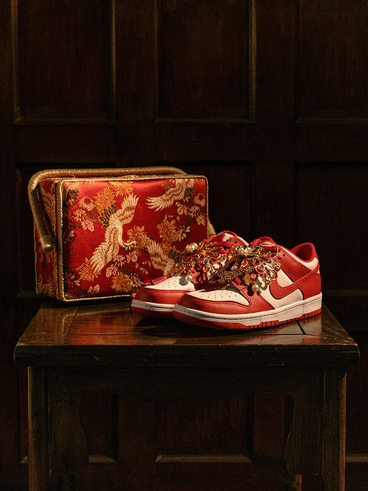 以「龙凤呈祥」为主题,这 4 款婚鞋分别采用了 Air Force 1、Air Jordan 1、Court 和 Dunk 鞋型为蓝本,带来红金色调的华丽喜庆效果。
