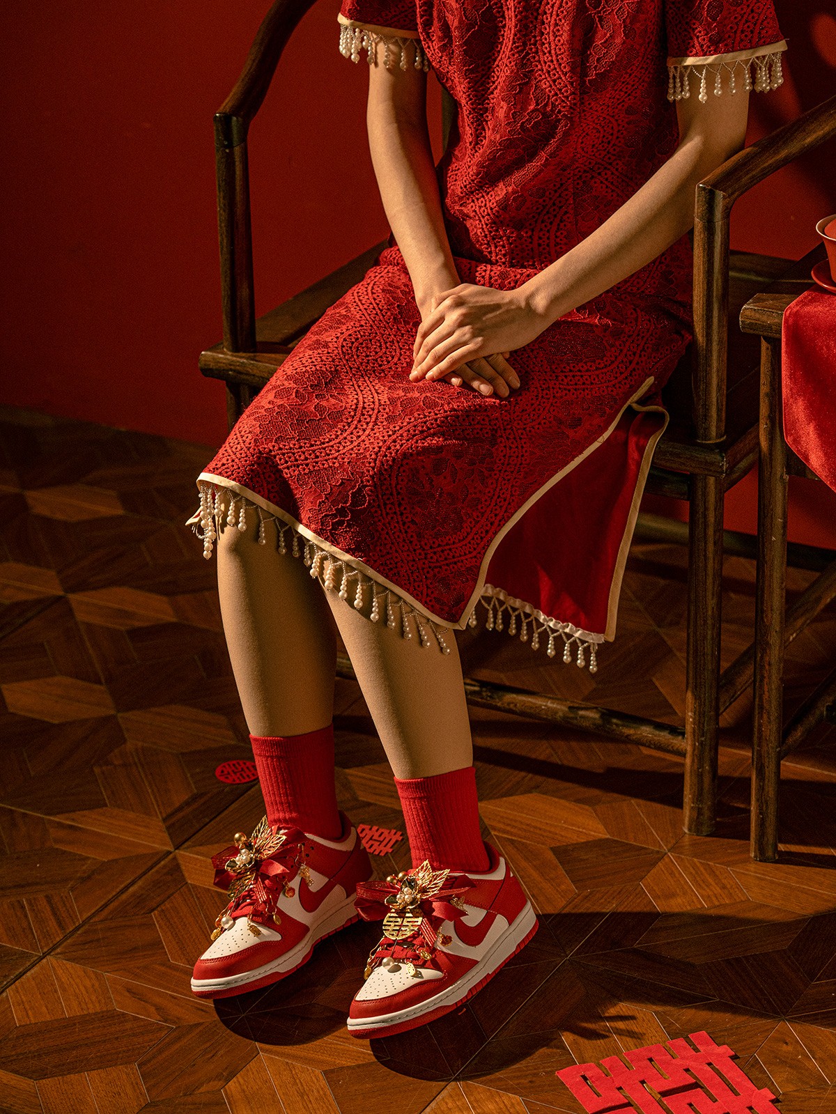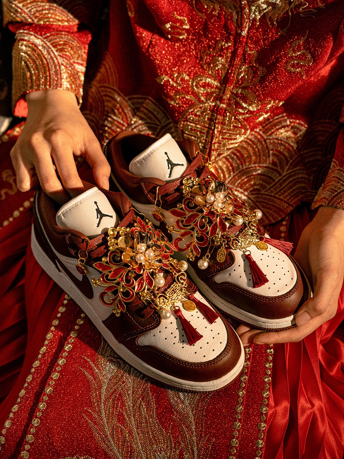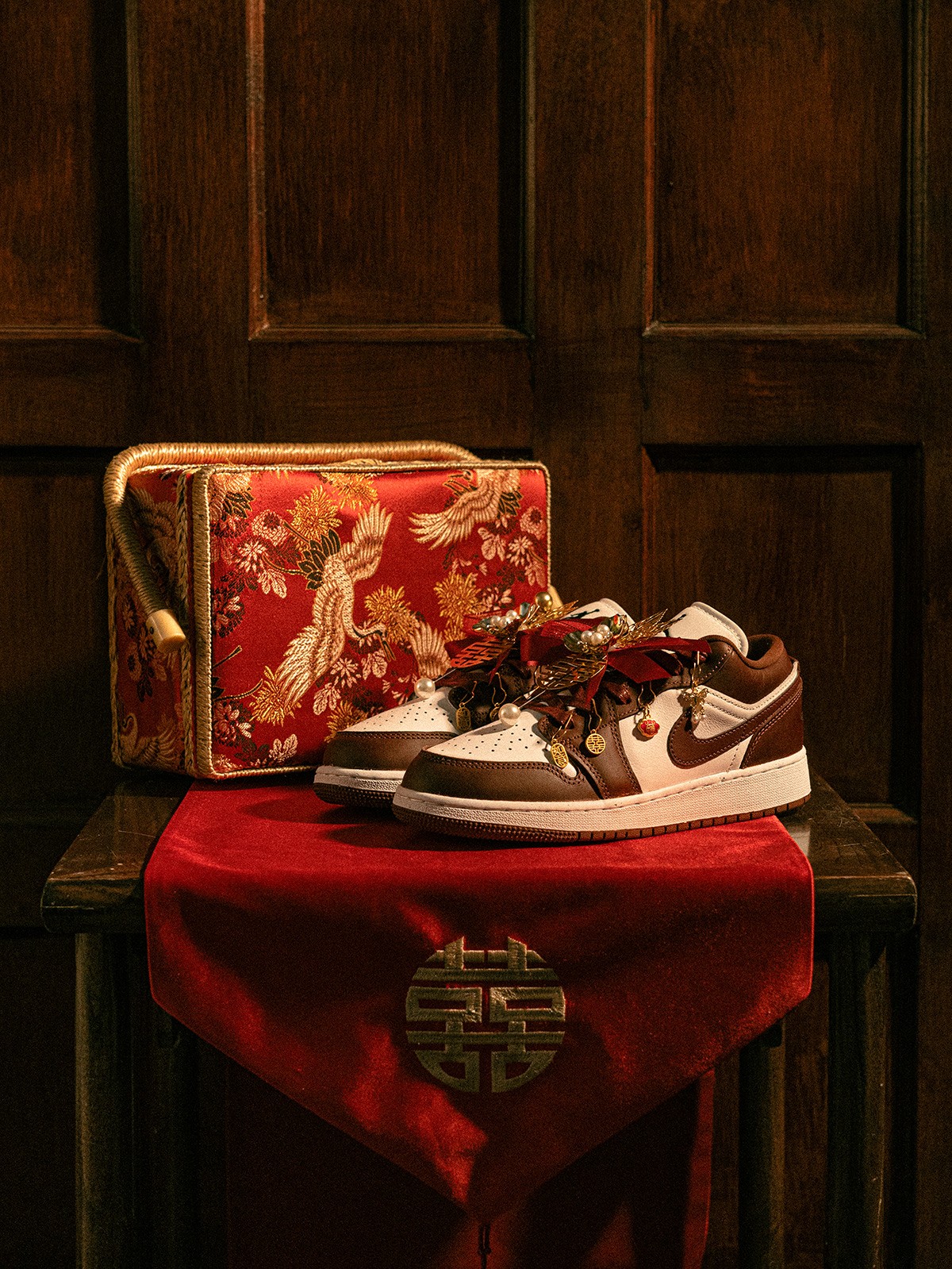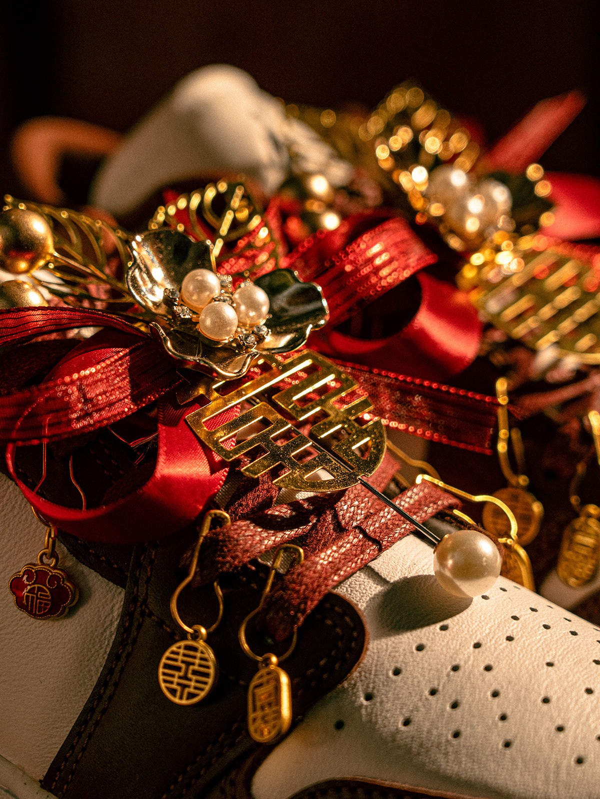在五金件的细节方面,能看到双喜、福字、吉祥、如意、珍珠等元素,这一份精致的喜庆感受,恐怕是球鞋圈的独一份。