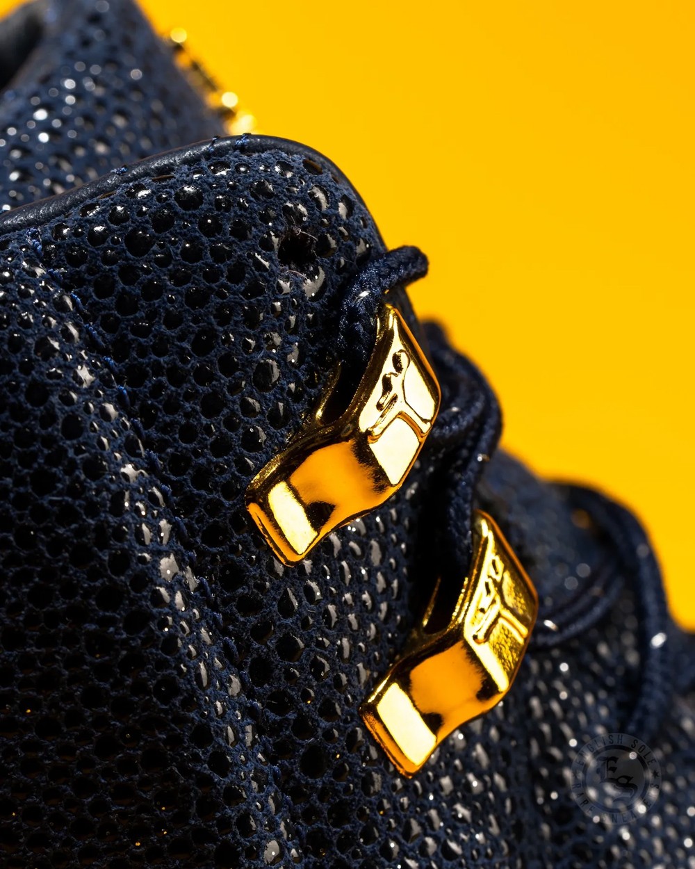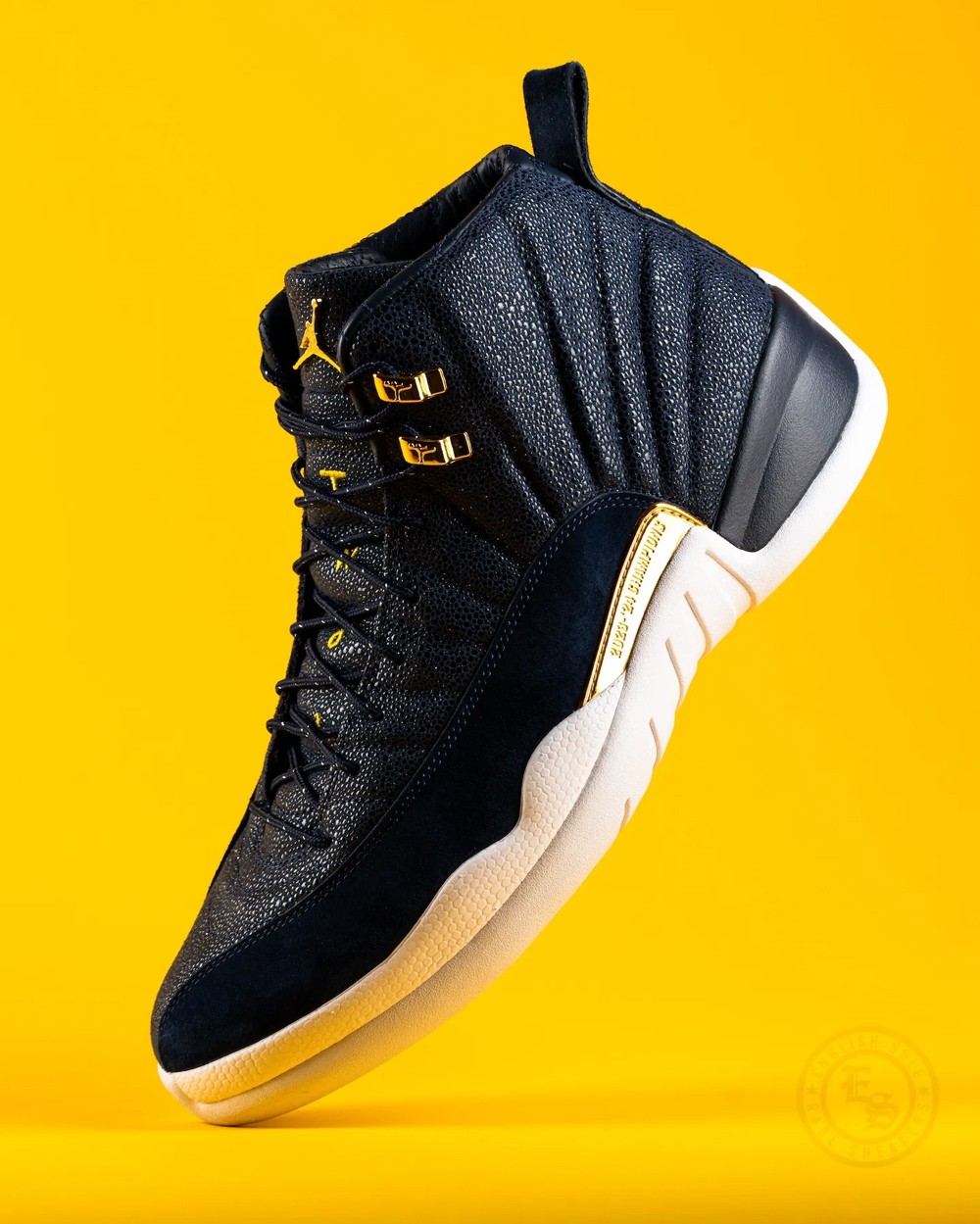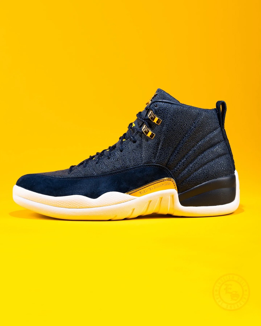 首先配色方面,采用密歇根大学传统的蓝黄装扮示人,细看 Air Jordan 12 不对称的鞋面,采用细腻的翻毛皮与魔鬼鱼皮共同构建,无论是视觉层次还是质感表现,都令人羡慕。