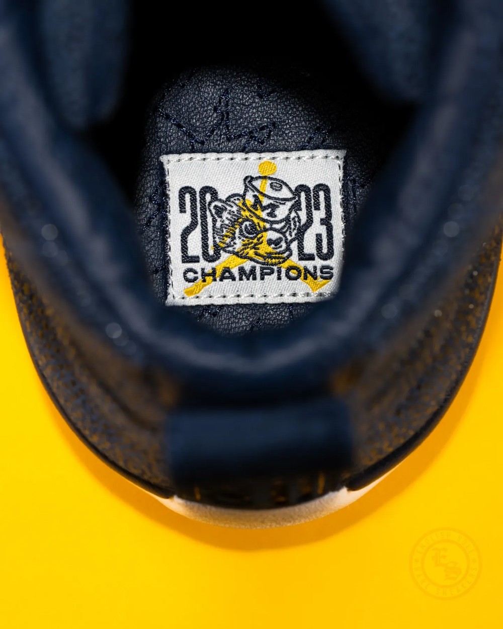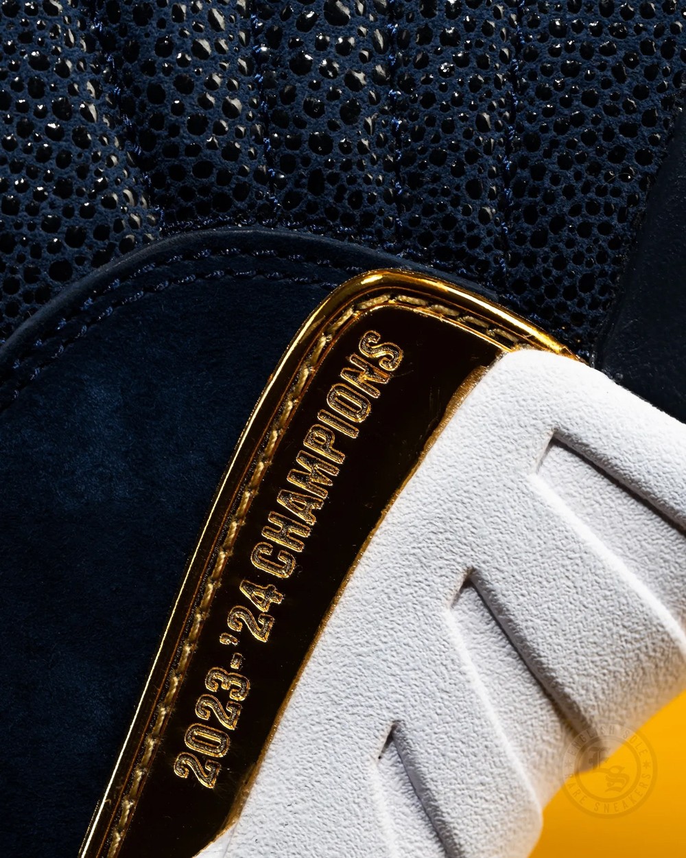 AJ12 标志性的金属鞋带扣采用象征荣耀的金色妆点,足弓稳定片则刻印有 23-24 全国冠军字样,并采用果冻外底,映衬出内部众多的密歇根校队元素。