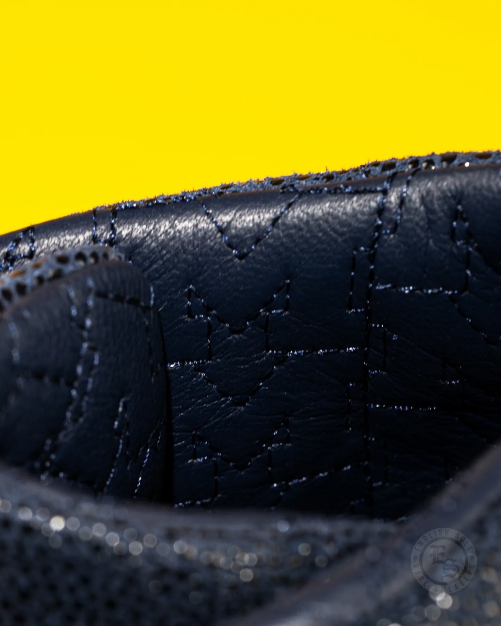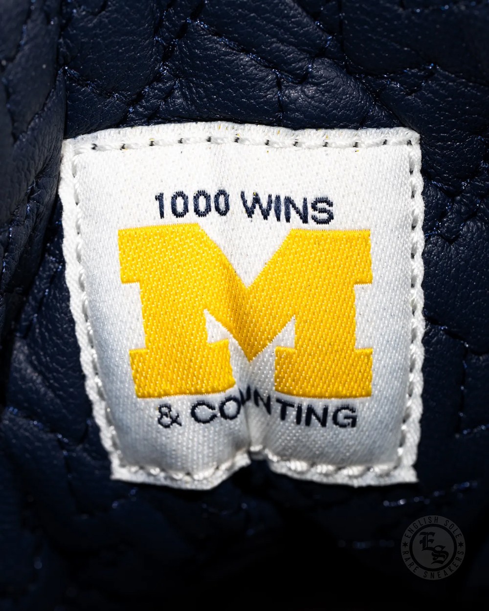 内衬不同于传统的纯棉织物或零星格纹,特别选用代表密歇根缩写的 M 车线与皮革打造,呼应后跟的 M Logo。
