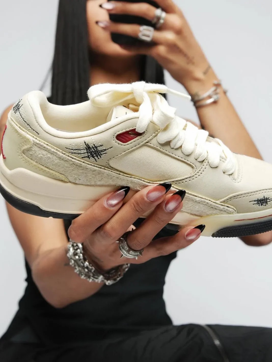 是以 Jordan Flight Court 鞋型为基础,鞋身安排上了多处的刺绣细节,这也是 Who Decides War 在牛仔裤上经常会用到的元素。