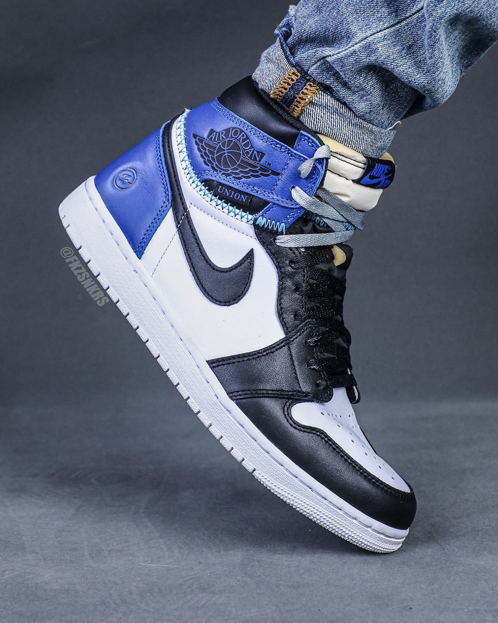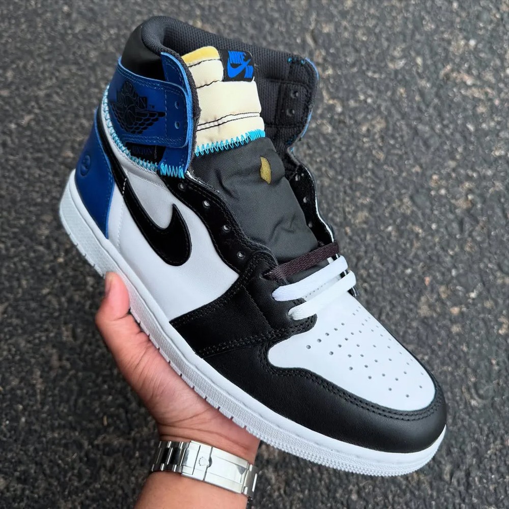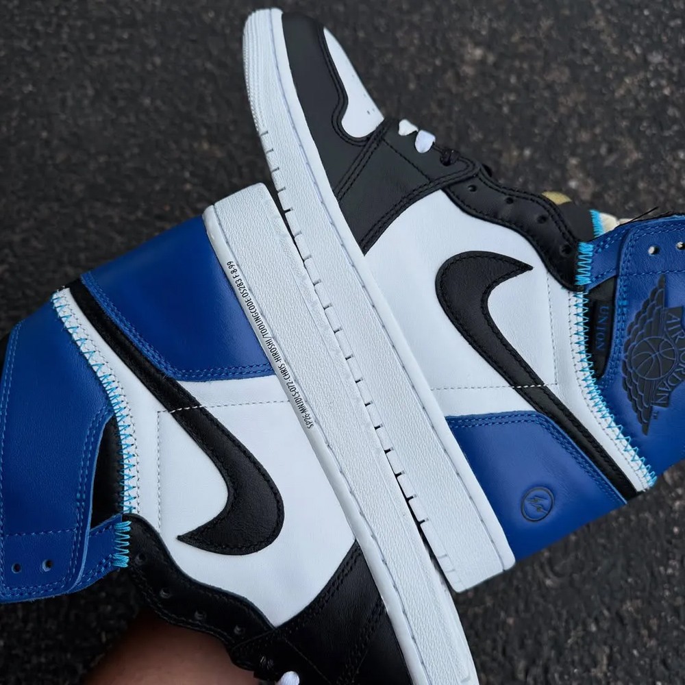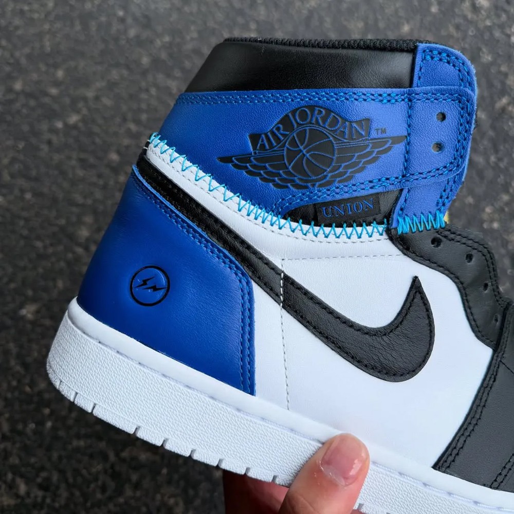 设计延续初代「大闪电」 fragment x Air Jordan 1 的经典的黑/皇家蓝/白色框架,同时本次细节注入 Union 标志性解构手法。