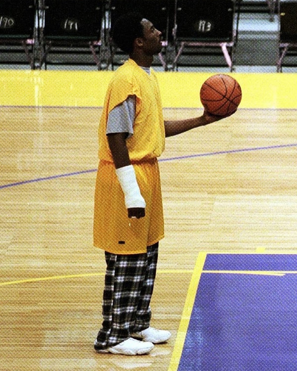 这张照片拍摄于 1999 年,科比右手受伤打着石膏,身上还穿着睡衣睡裤,左手拿球站在罚球线上,依然坚持训练。