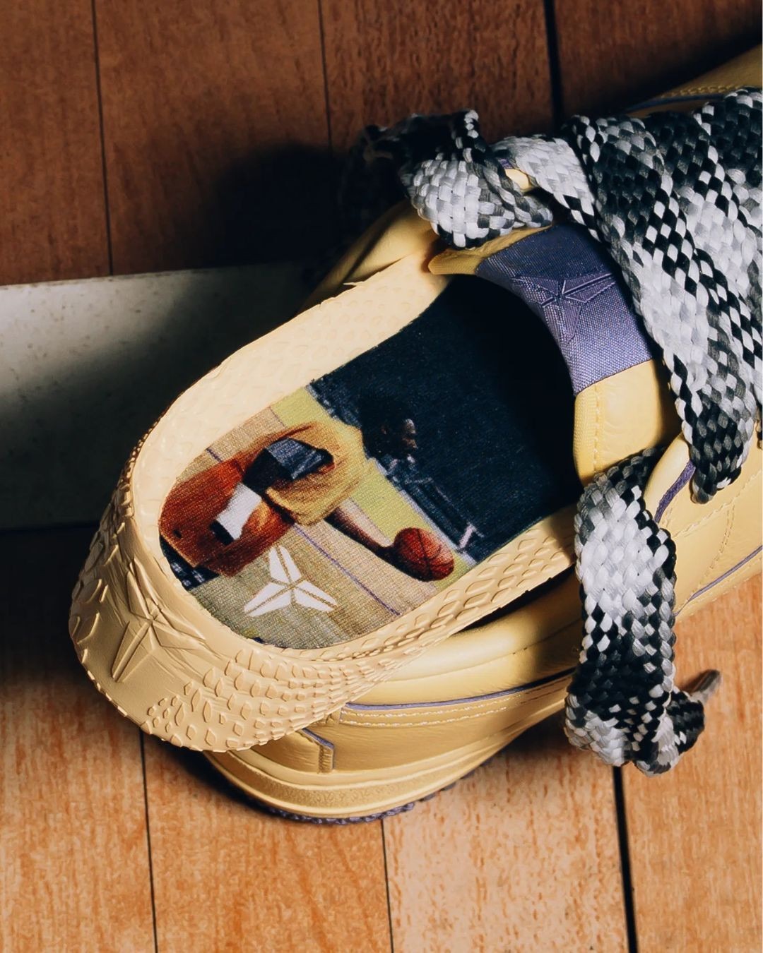 本次的配色灵感来源于科比曾经单手训练的 “名场面”,黄色的氛围也迎合了当天科比的穿着。