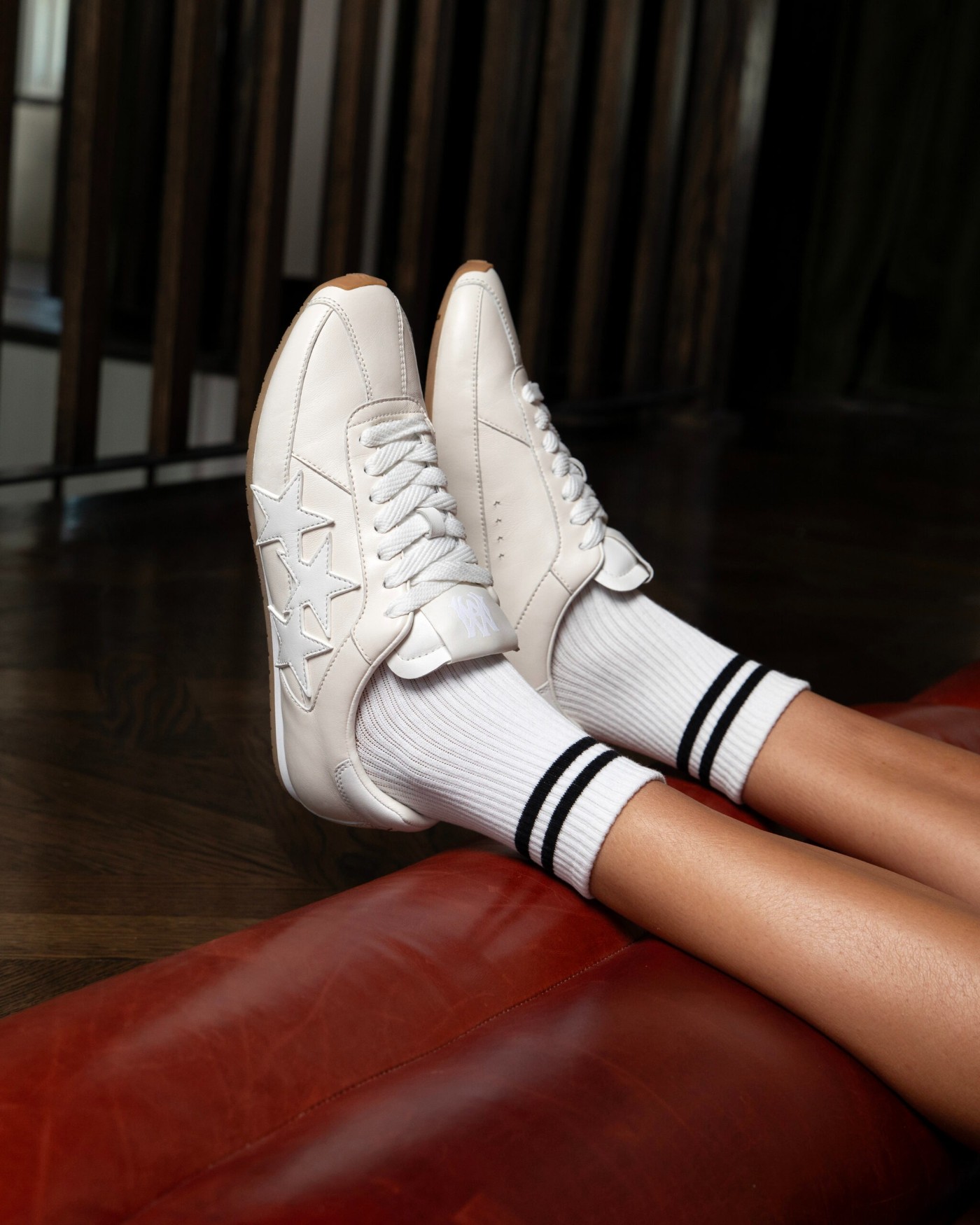 以 “骨头鞋” 而被大家熟知的奢侈品牌 AMIRI 带来全新的鞋型 Pacific Flat。 该鞋型以复古运动鞋为蓝本,采用了优质皮革,带来一个「薄底鞋」风格的新品。 本季新品包含了⿊⾊⽪⾰、⽩桦⾊⽪⾰和驼⾊麂⽪ 3 款配色,鞋身侧边以 3 个白色的五角星装饰,成为了这双鞋最具辨识度的视觉亮点。 延续了 AMIRI 一贯的简约、奢华风格,在上脚穿搭方面也能轻松适应各种场景,也很适合当下的季节。 该鞋型定位于女鞋,中国区的定价在¥4910 RMB 左右,有兴趣的朋友不妨关注。
