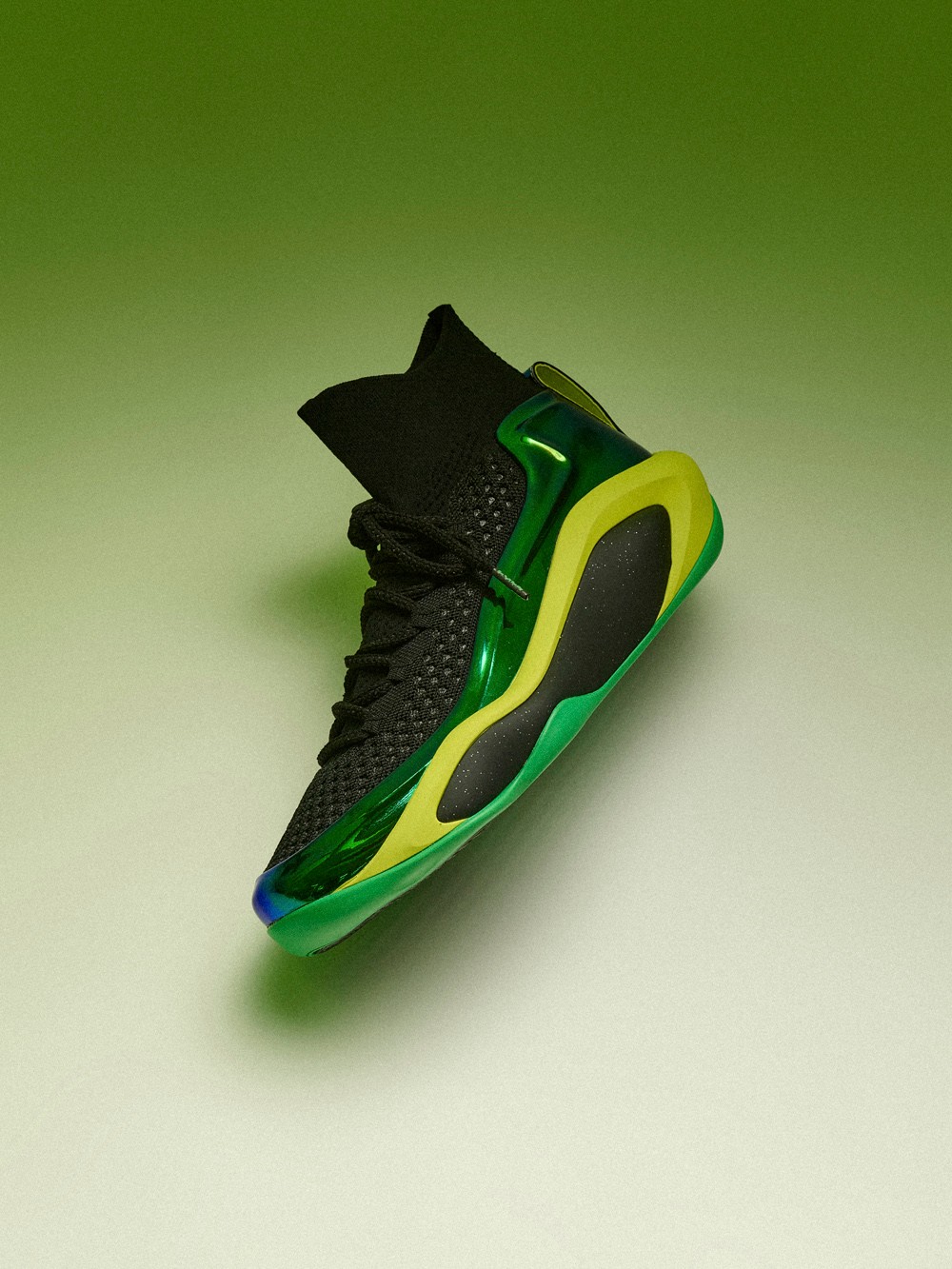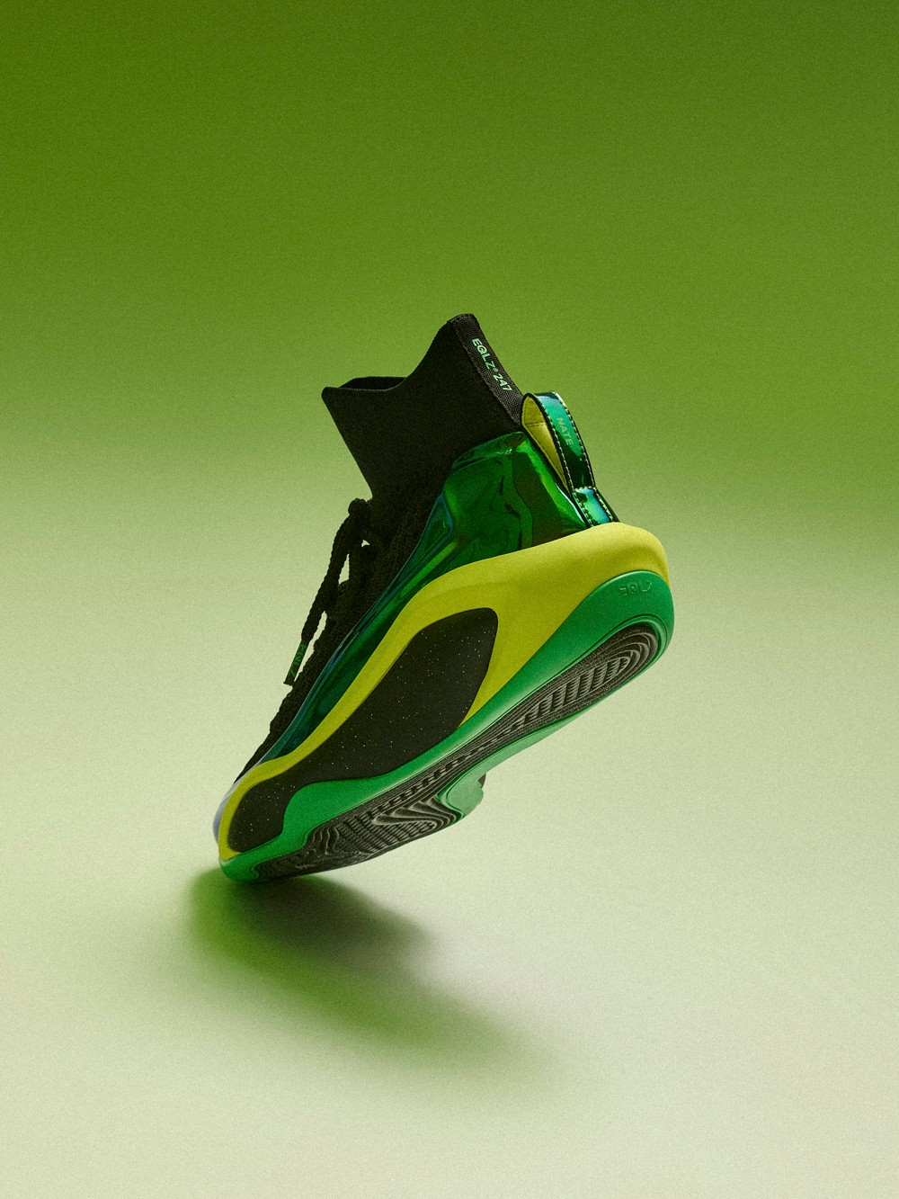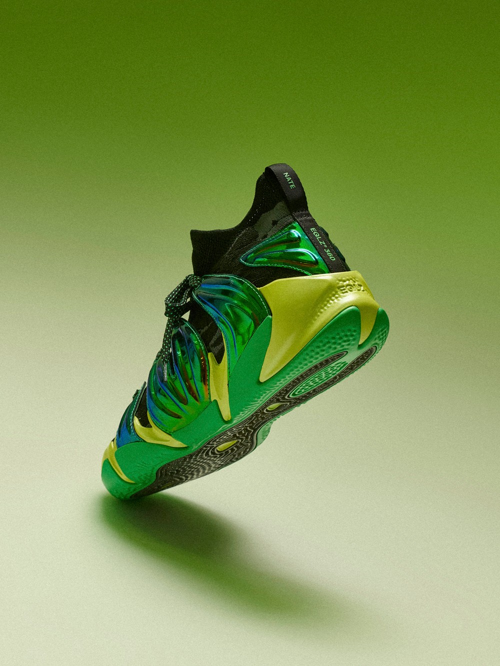 配色方面,选自内特扣篮大赛大放异彩的 Kryptonite(氪石)为主题,采用电光绿和闪耀的阳光色组合,致敬他在扣篮大赛上的高光时刻。