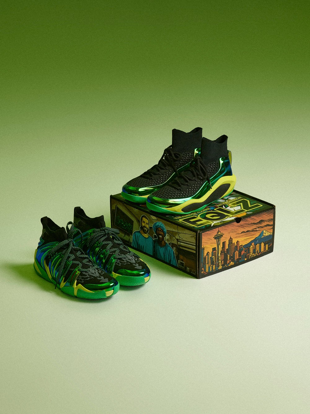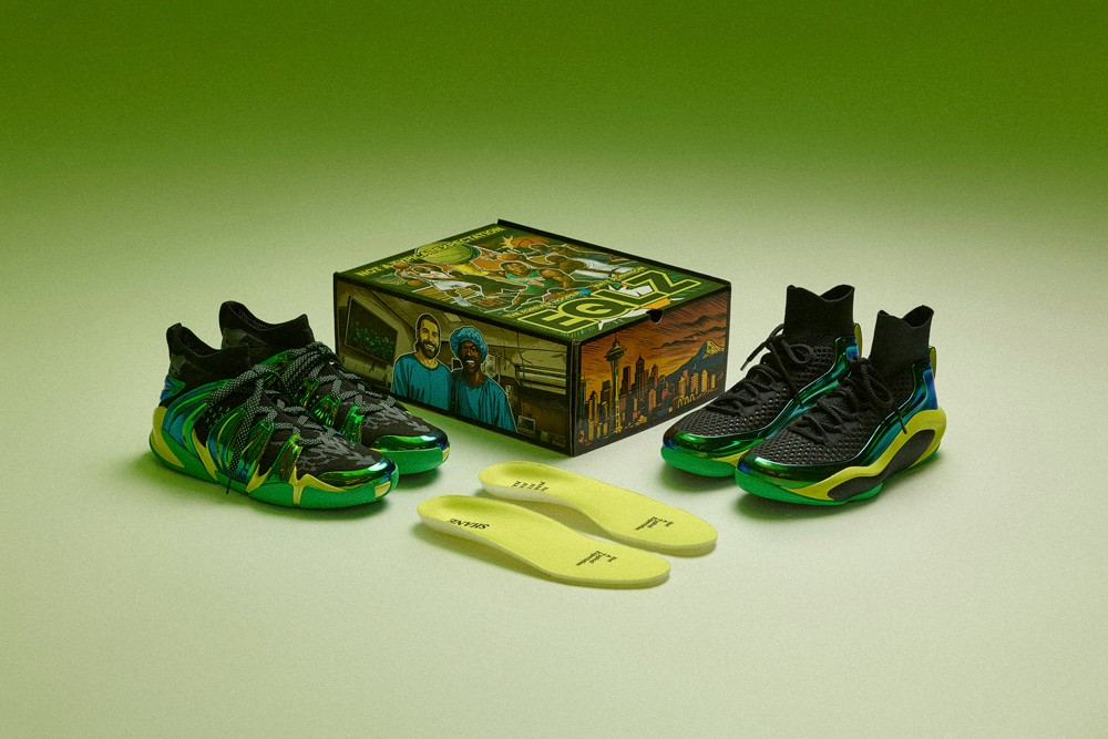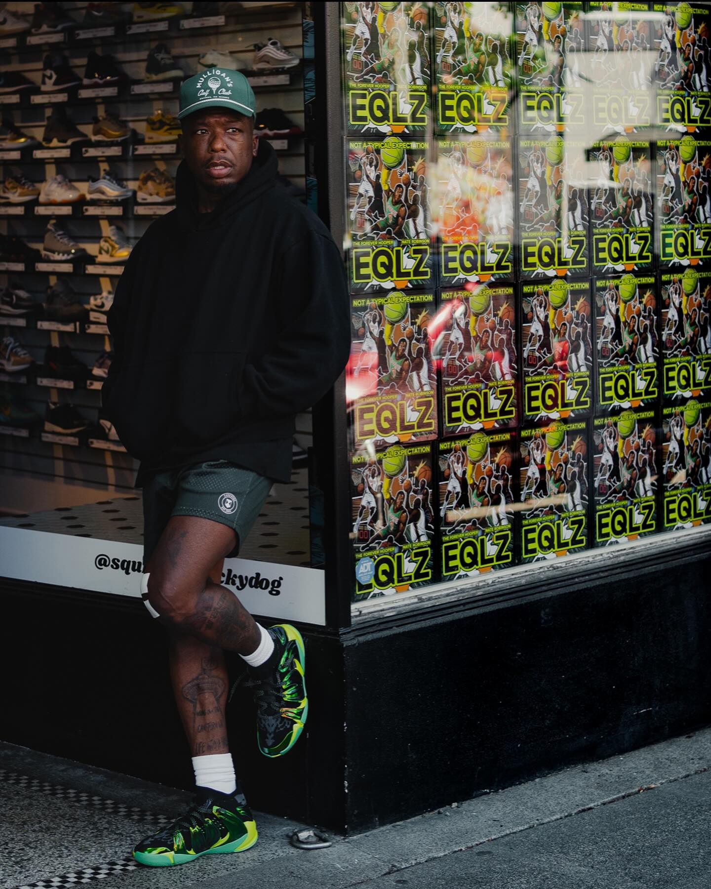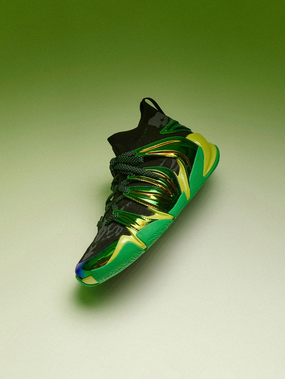 配色方面,选自内特扣篮大赛大放异彩的 Kryptonite(氪石)为主题,采用电光绿和闪耀的阳光色组合,致敬他在扣篮大赛上的高光时刻。