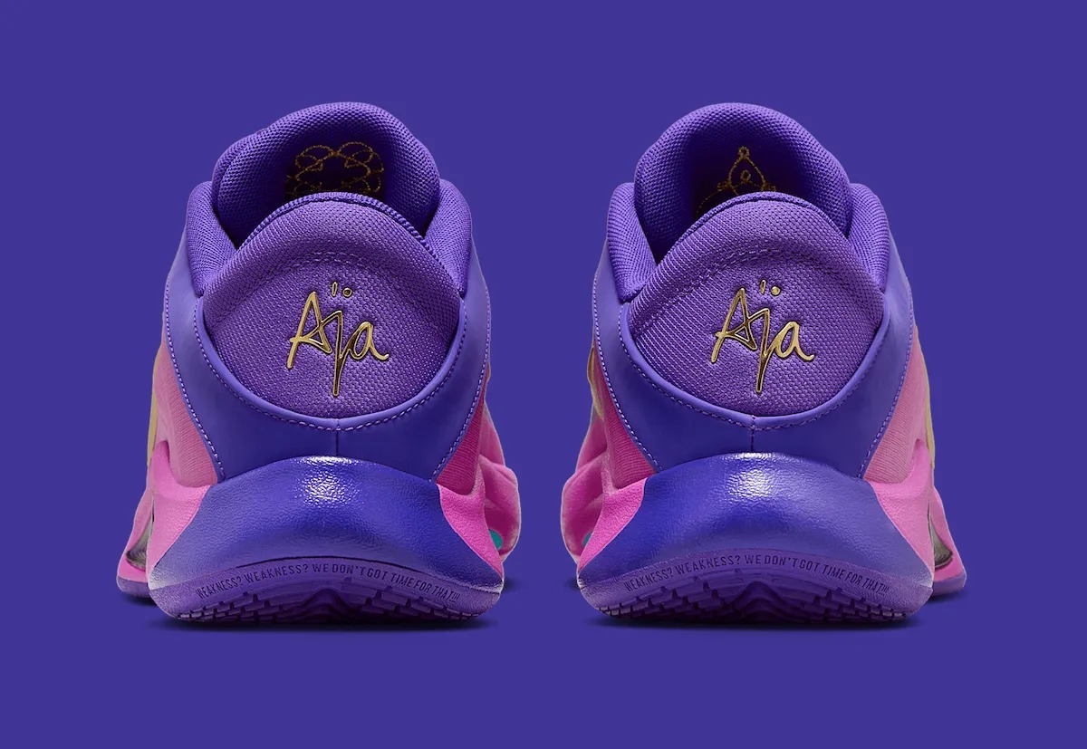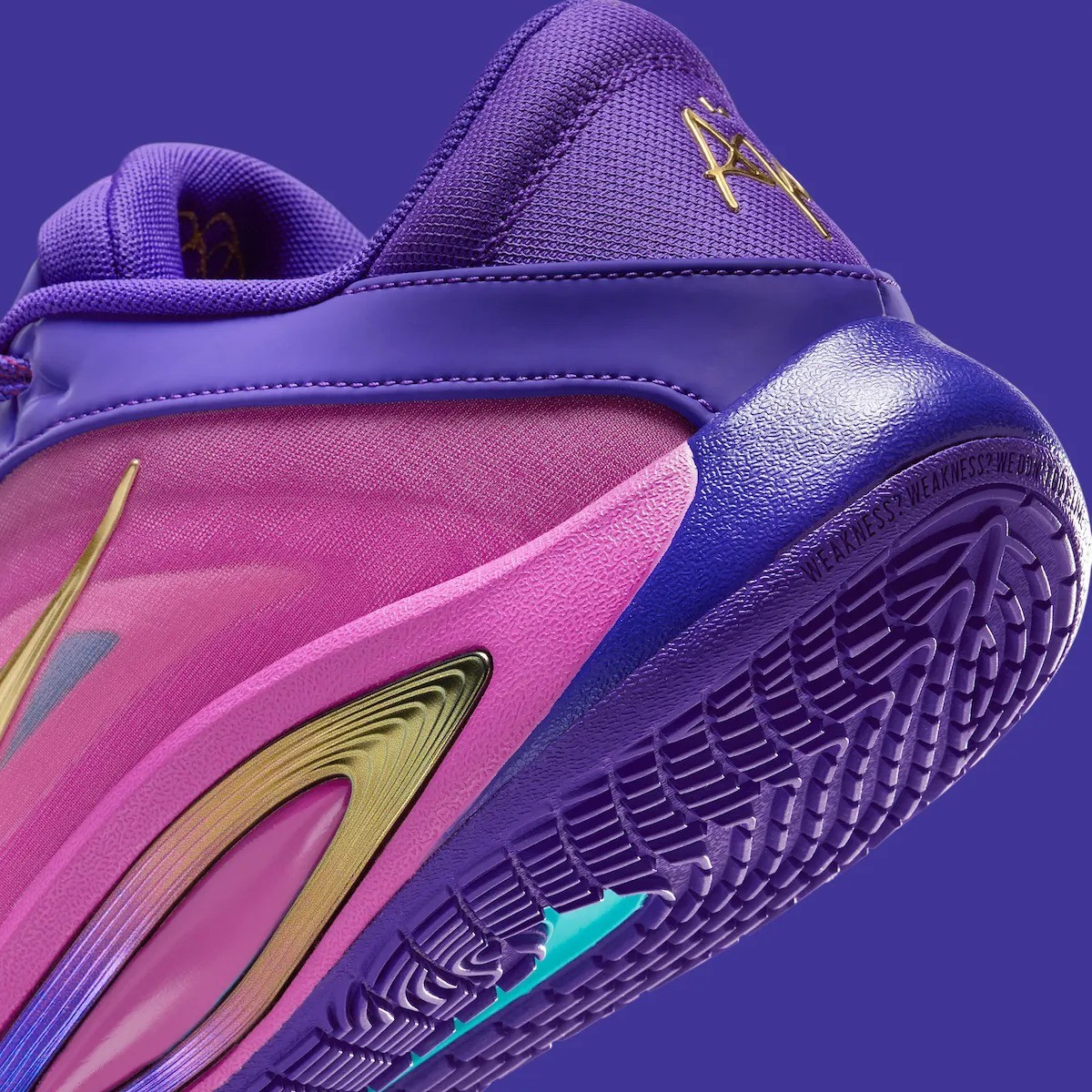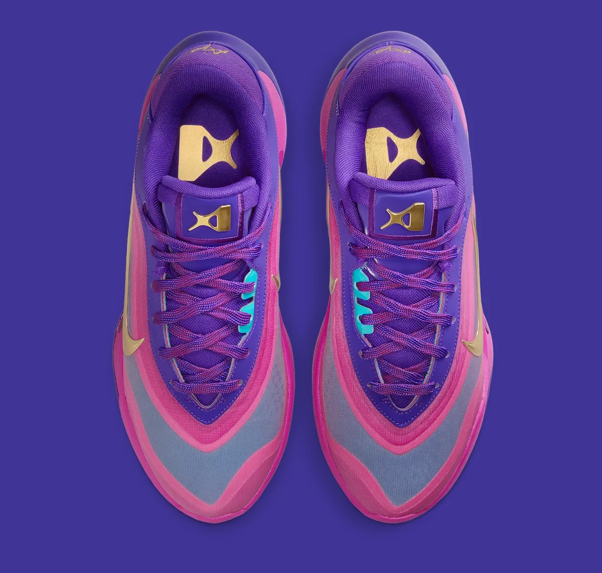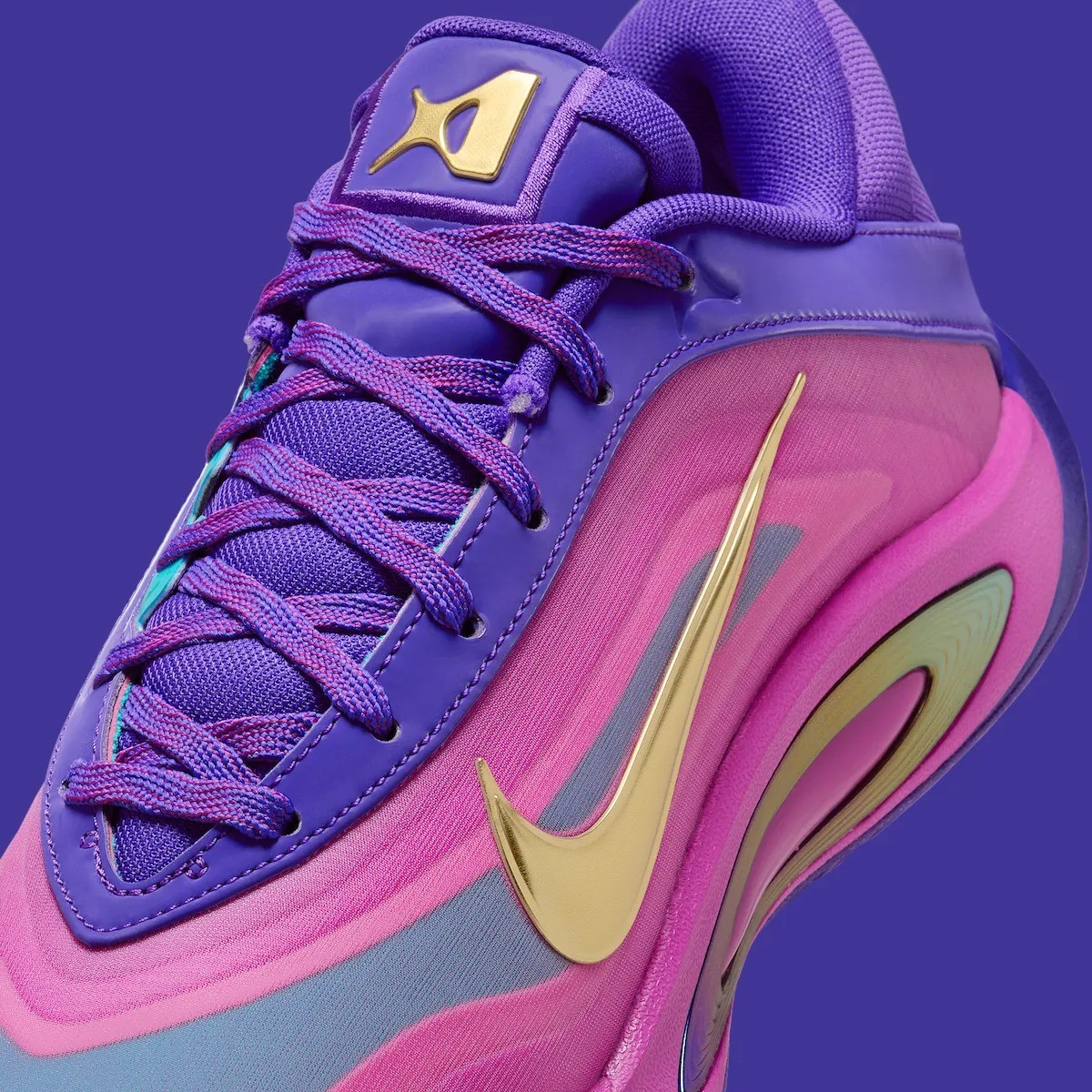 华丽的金色 Swoosh 是这双鞋最大的视觉亮点,紫色和红色渲染出女性的甜美气息,让这双鞋在呈现阿贾个人感受的同时,也有耀眼的荣耀氛围。
