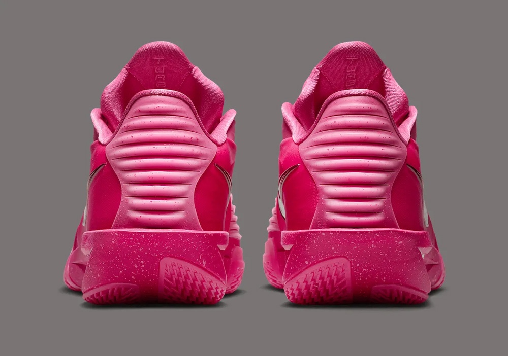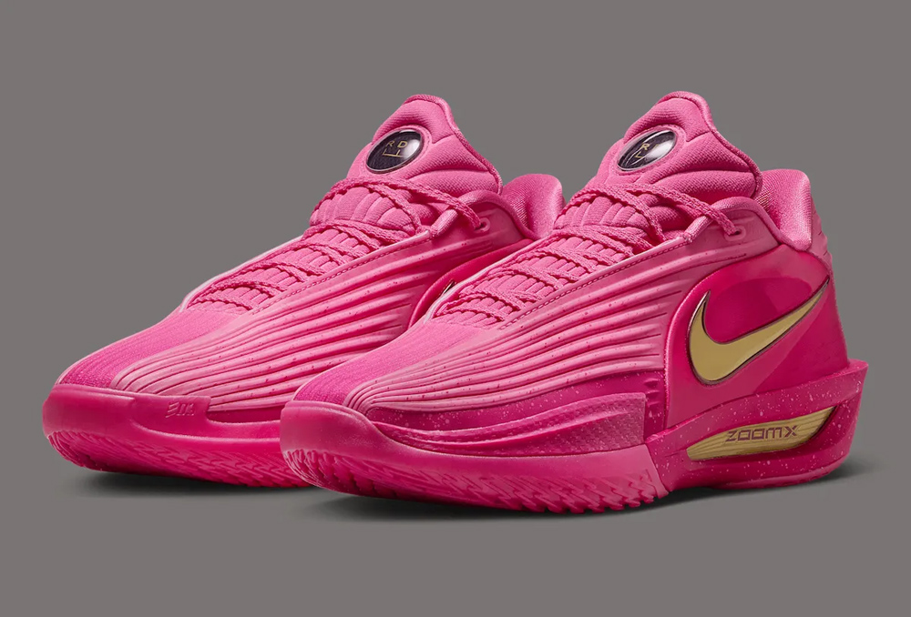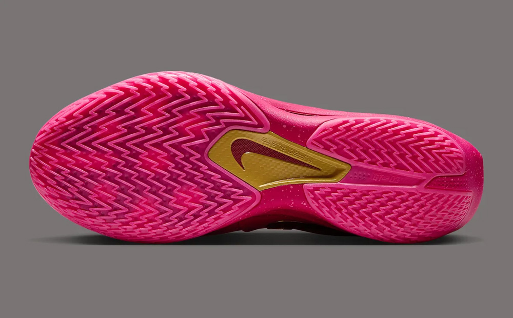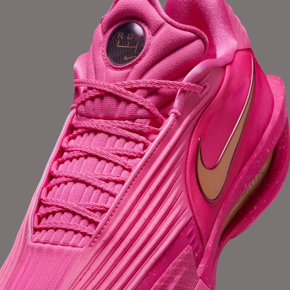 鞋身采用亮骚的猛男粉覆盖,细节辅以金色点缀。