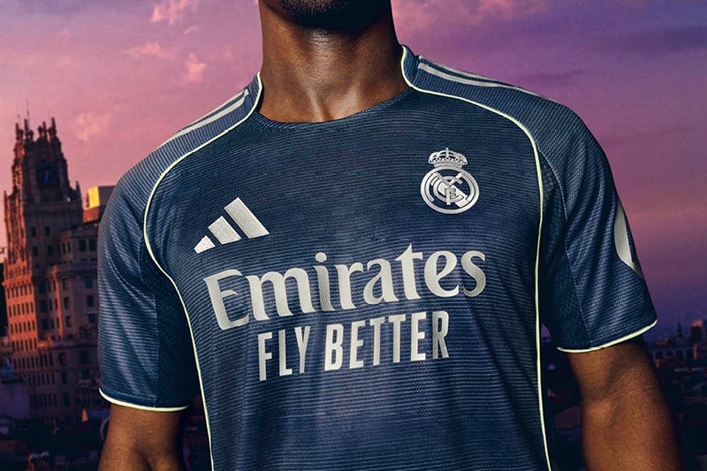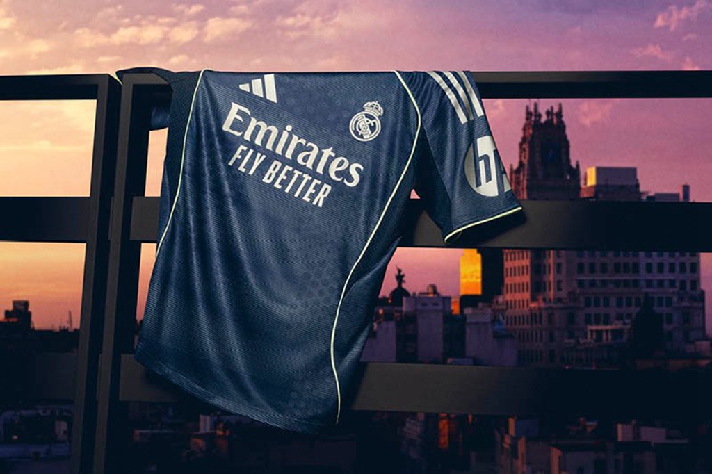 球衣以象征伊比利亚夜空的深邃靛蓝为底色,复刻聚光灯下伯纳乌的迷人景致。
