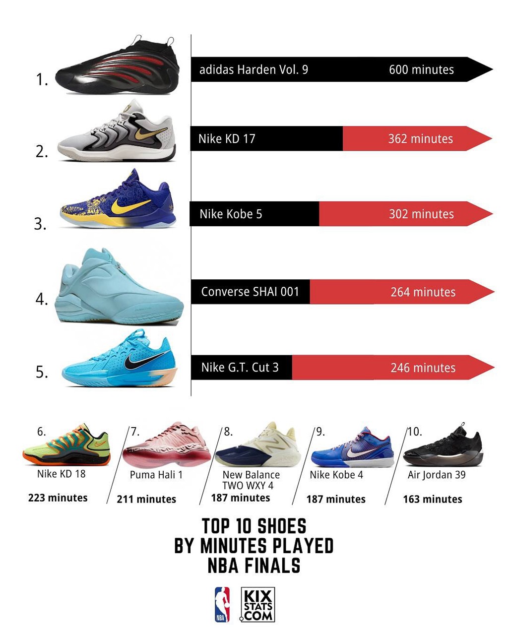 就在今早,知名球鞋统计媒体 @kixstats 给出了最新数据,将今年总决赛「球鞋登场时长」做了个排名!