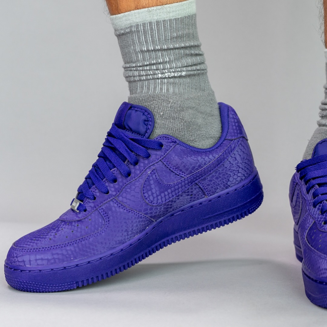 采用一袭紫色装扮,鞋面呈现出类似蛇鳞的纹理效果,丰富了单色鞋身的层次感,同时彰显了它不同于常规款 Air Force 1 的身份。