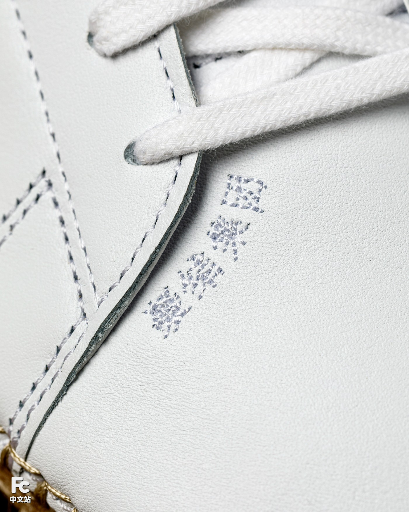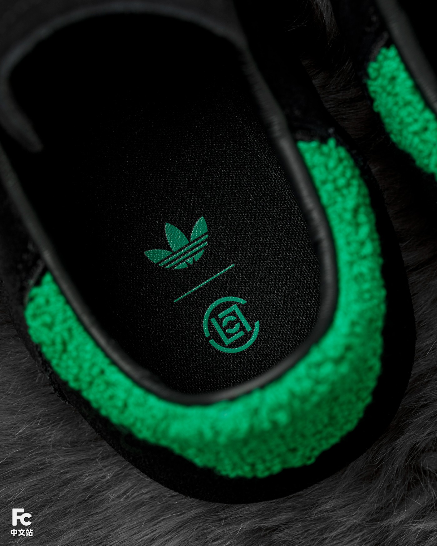 白色鞋面 + 绿色鞋尾,后跟找不到品牌标识,与鞋身同色的「凝结集团」、「CLOT」刺绣也显得十分低调了。