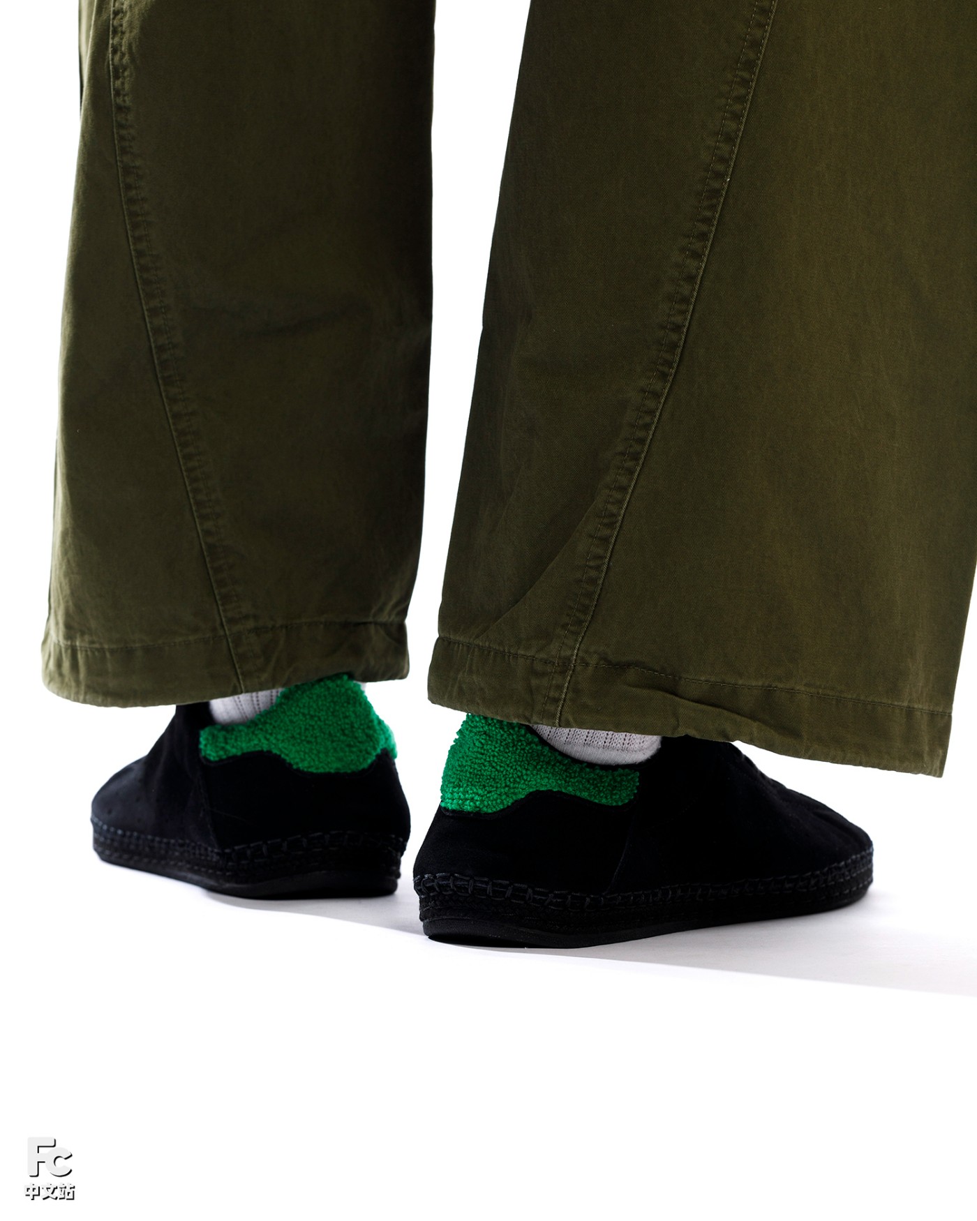 另一款从配色到材质都进行了全新演绎,以全麂皮包裹,鞋身一黑到底,连同草编中底也是黑色呈现。