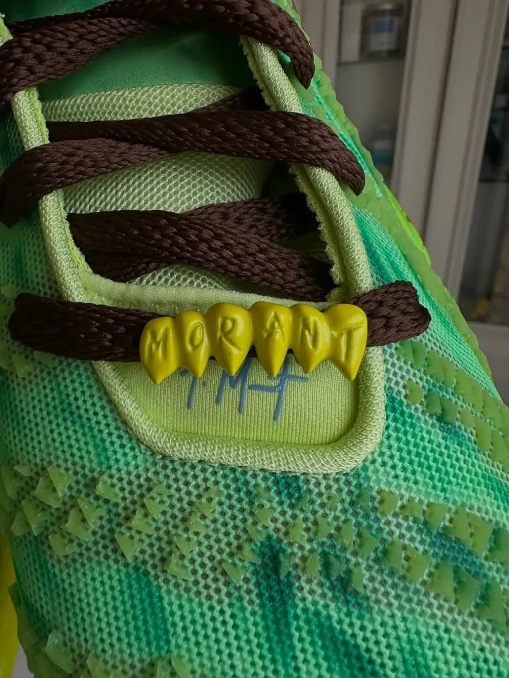 细节方面,鞋带前段延续了经典的獠牙设计,上方还有莫兰特的名字。
